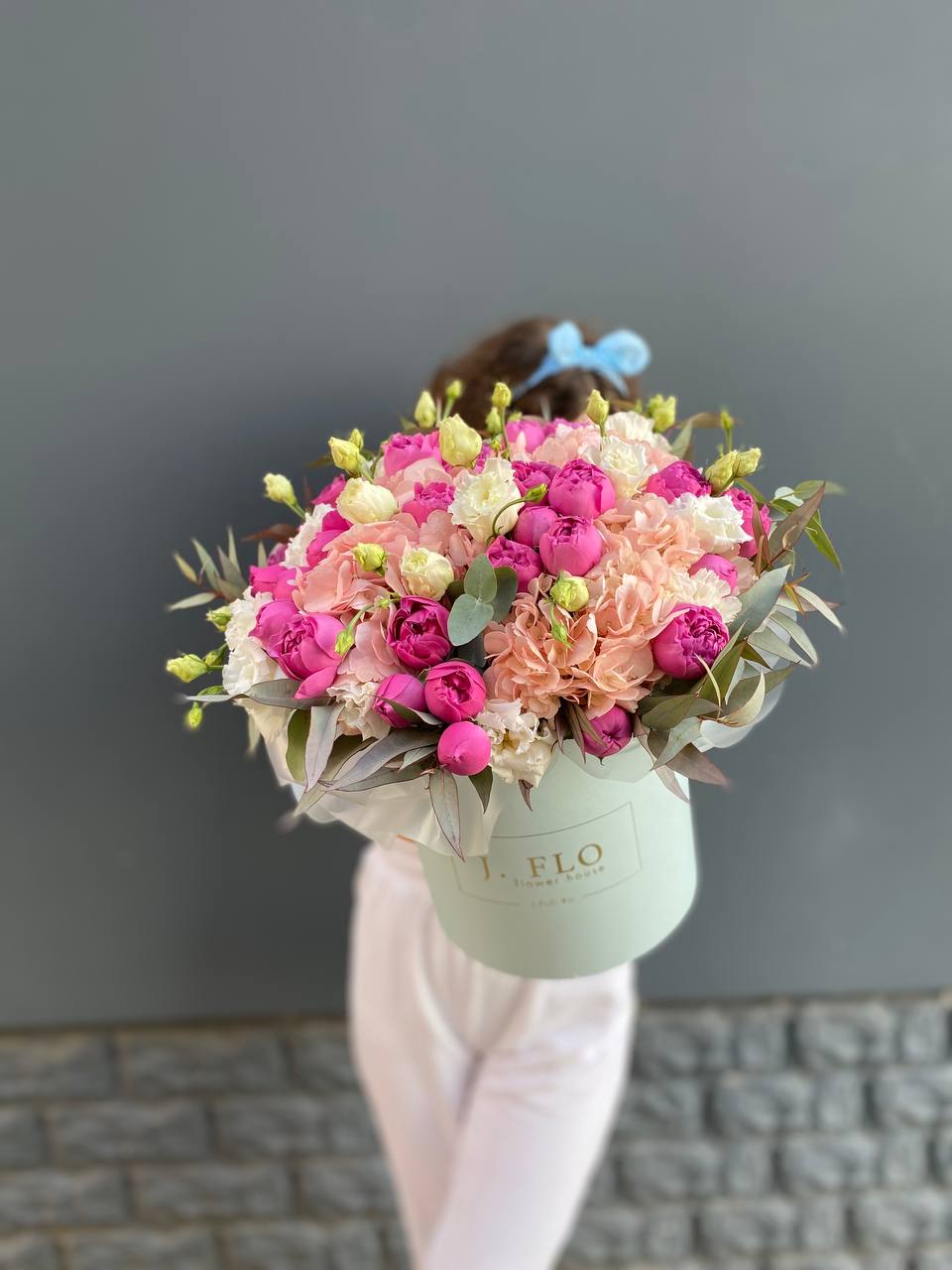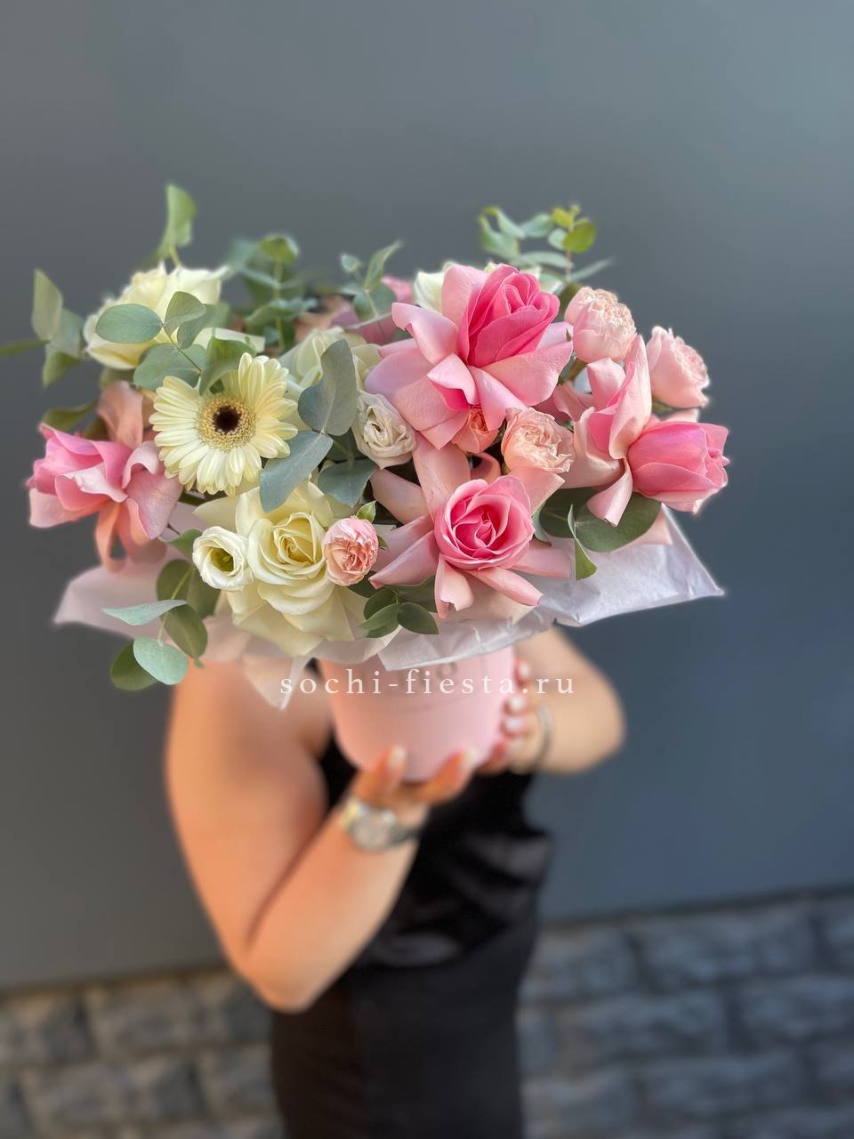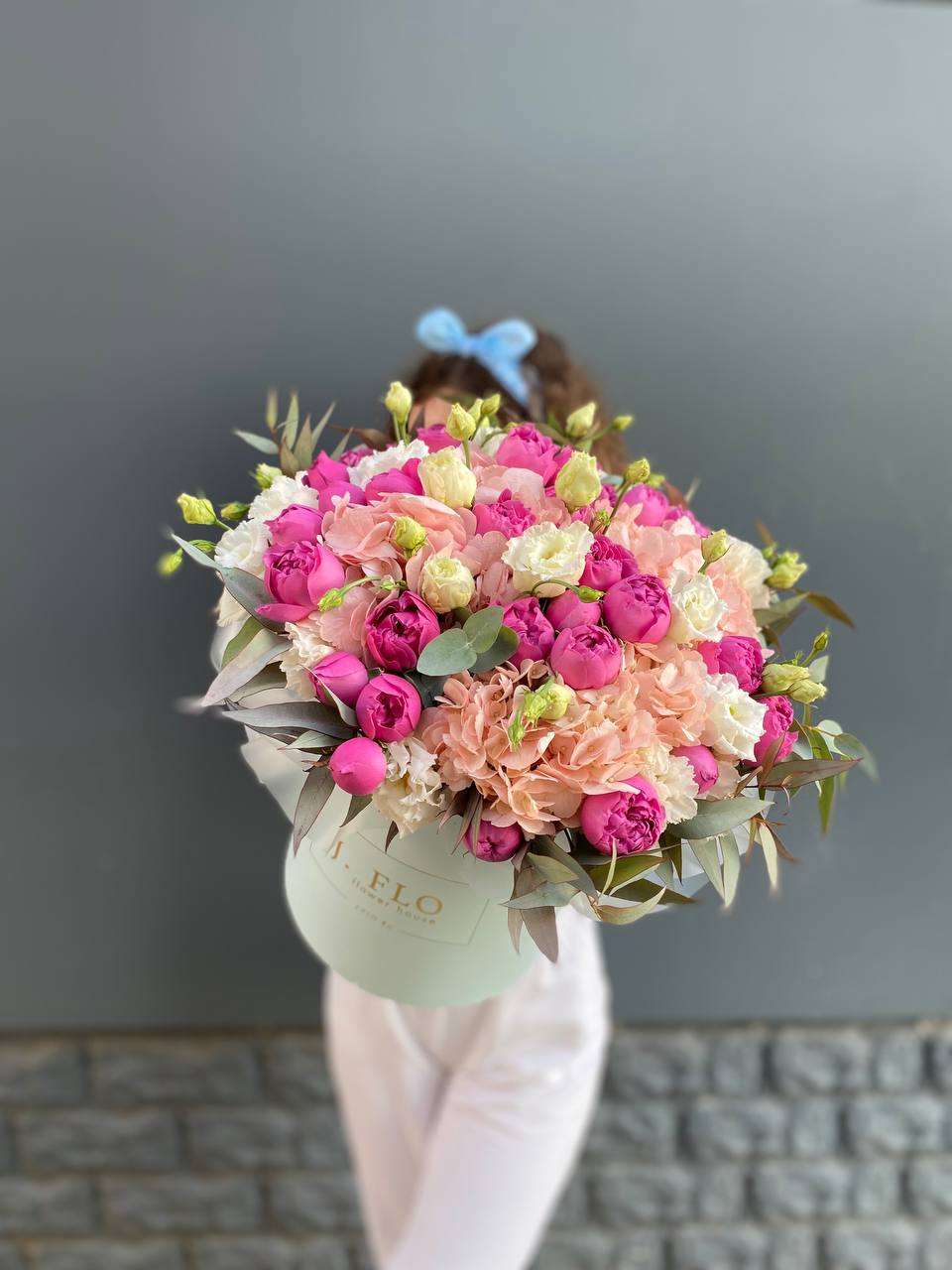 гортензия, французские розы, диантусы, эустома, цилиндр D16, бумага тишью.
