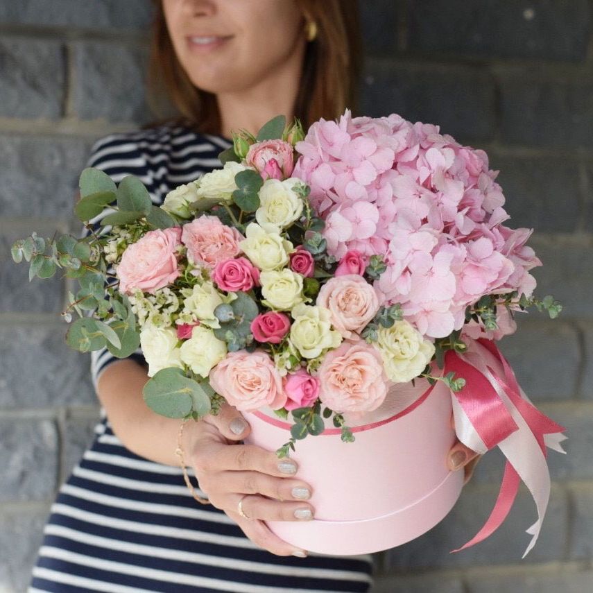 Гортензия создает пышную основу для французских роз и диантусов с эустомой. Цилиндр компактен и не требует дополнительной вазы. Розовая гамма раскрывается слоями от бледных до насыщенных оттенков.