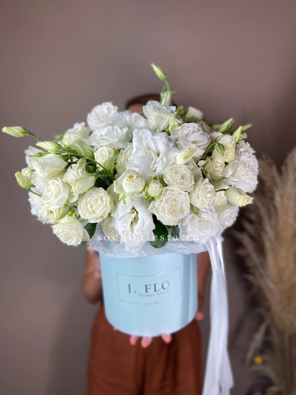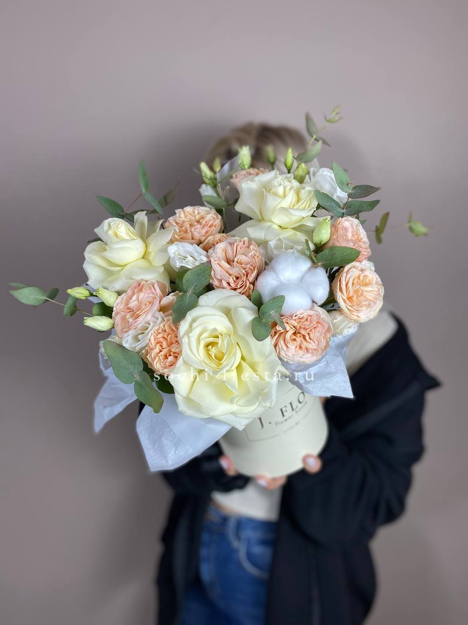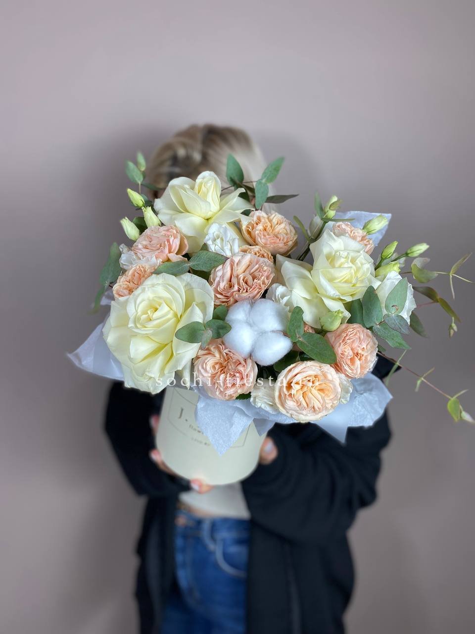 кустовые пионовидные розы сорта Джульетта, цилиндр D20, эвкалипт, лента, тишью.