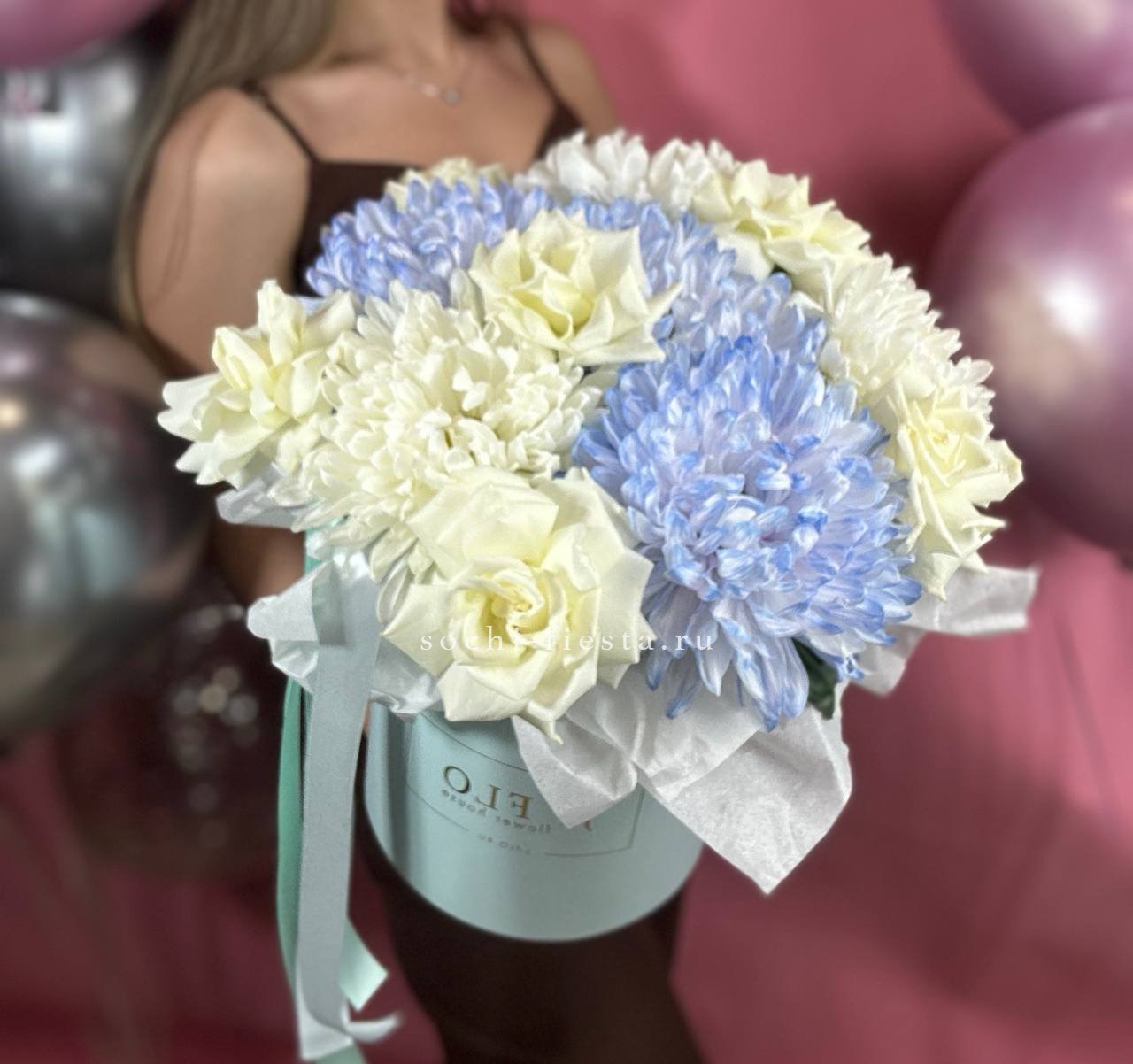 вывернутые белые розы, одноголовые хризантемы, цилиндр D20, лента.