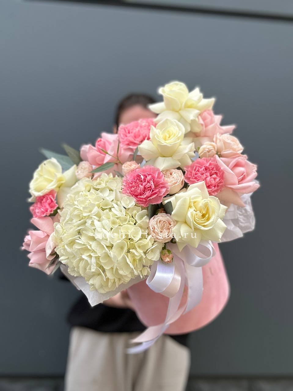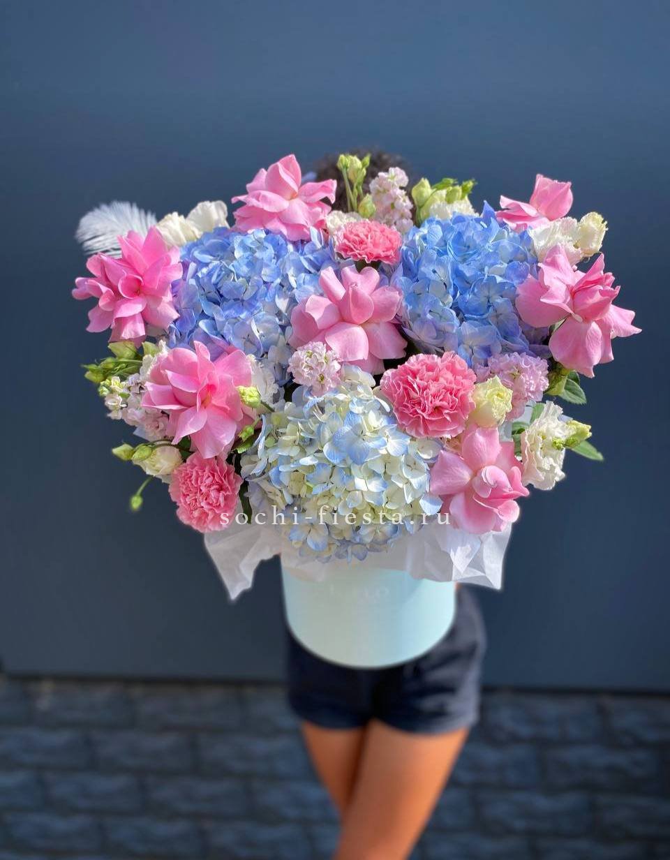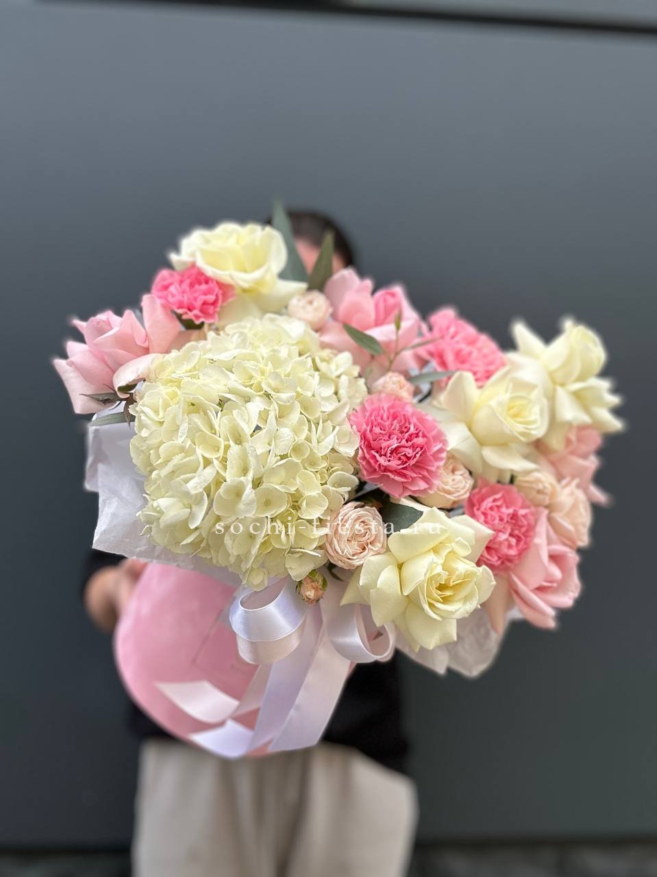 роза, диантус, пионы или гортензия, розы, бомбастик, эустома, декоративная зелень, цилиндр D16.