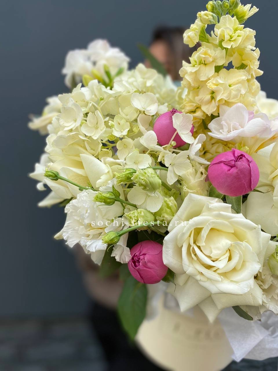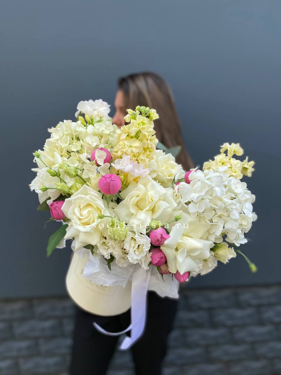 гортензия, пионовидные розы, эустома, эвкалипт, бокс 16.