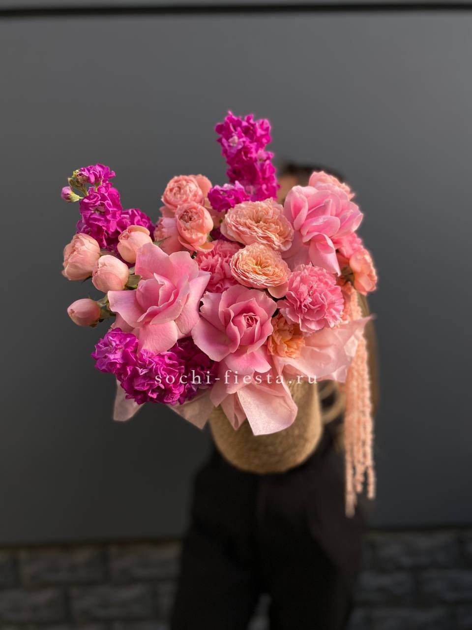 маттиола, французские розы, кустовые пионовидные розы, дианутсы, амарантус.