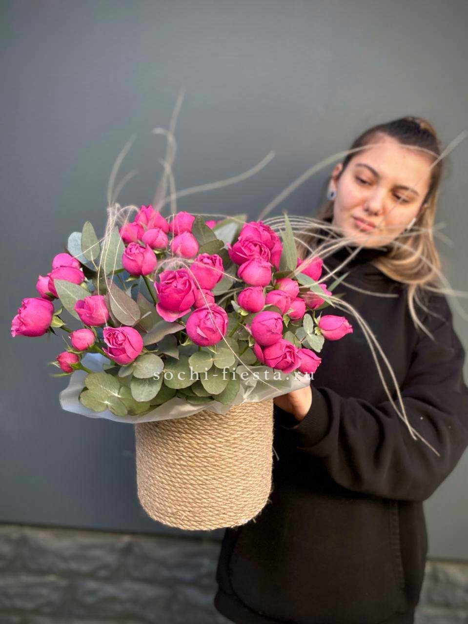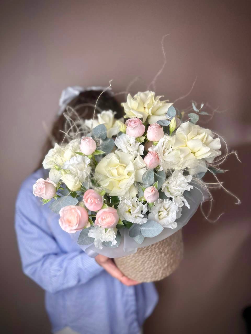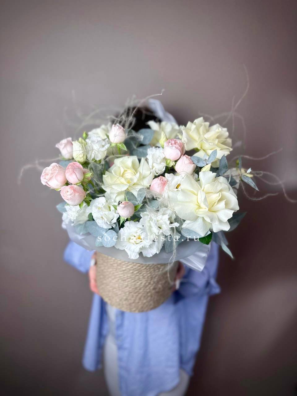 Воздушная гортензия окружает розы пудровых и снежных оттенков, а эвкалипт добавляет глубину и свежесть. Композиция собрана в натуральное джутовое кашпо, которое удобно разместить на столе или подоконнике.