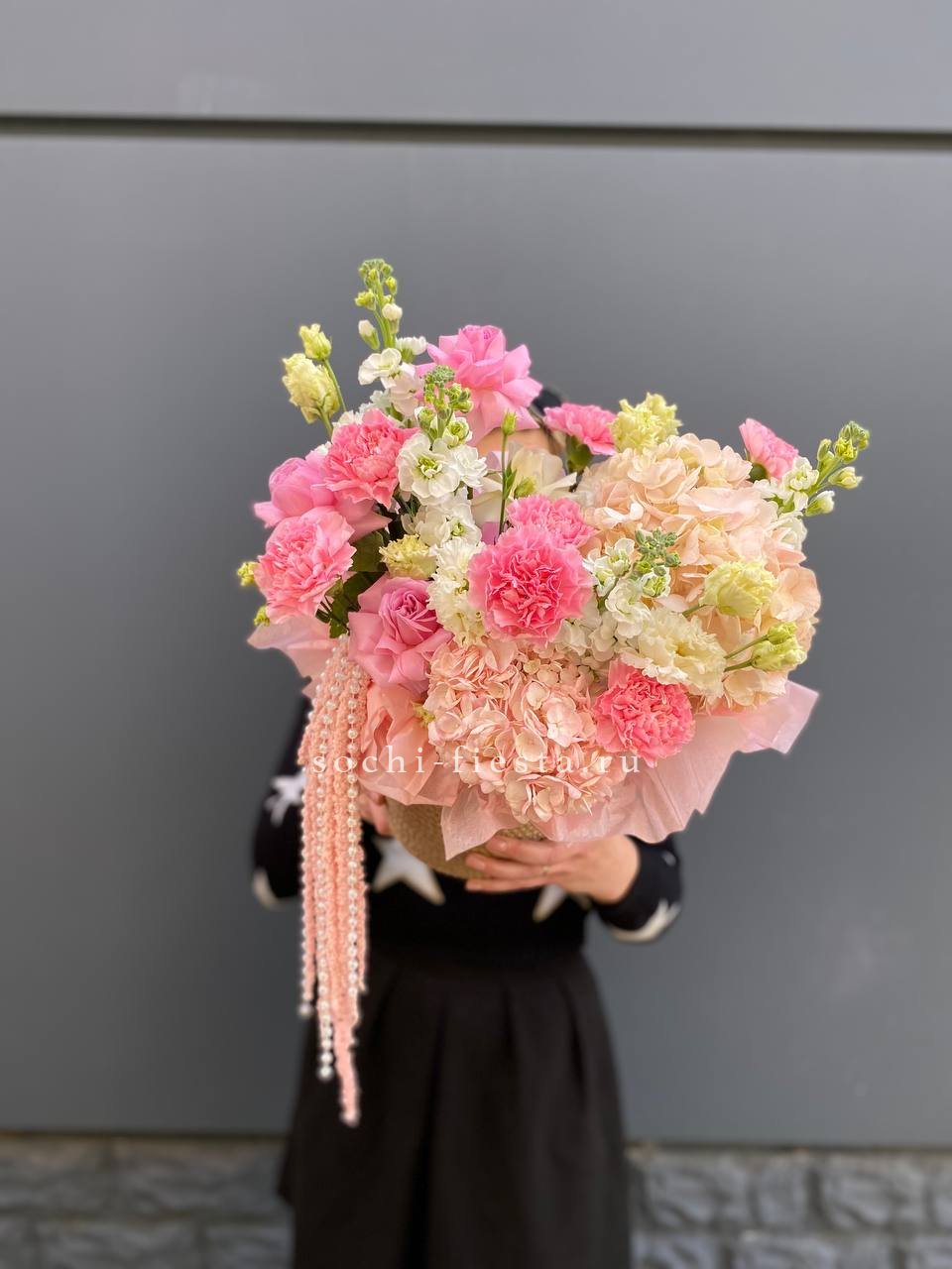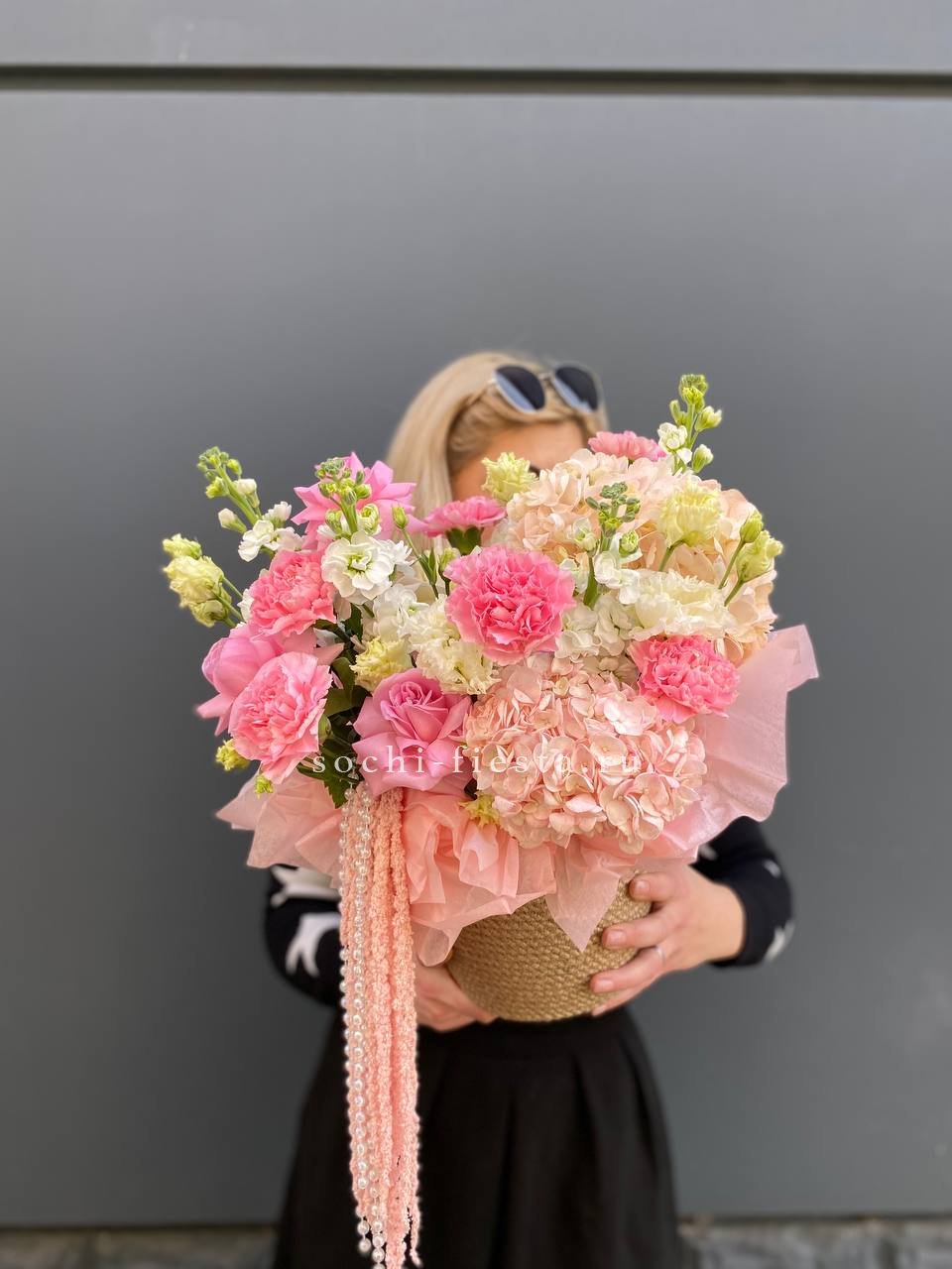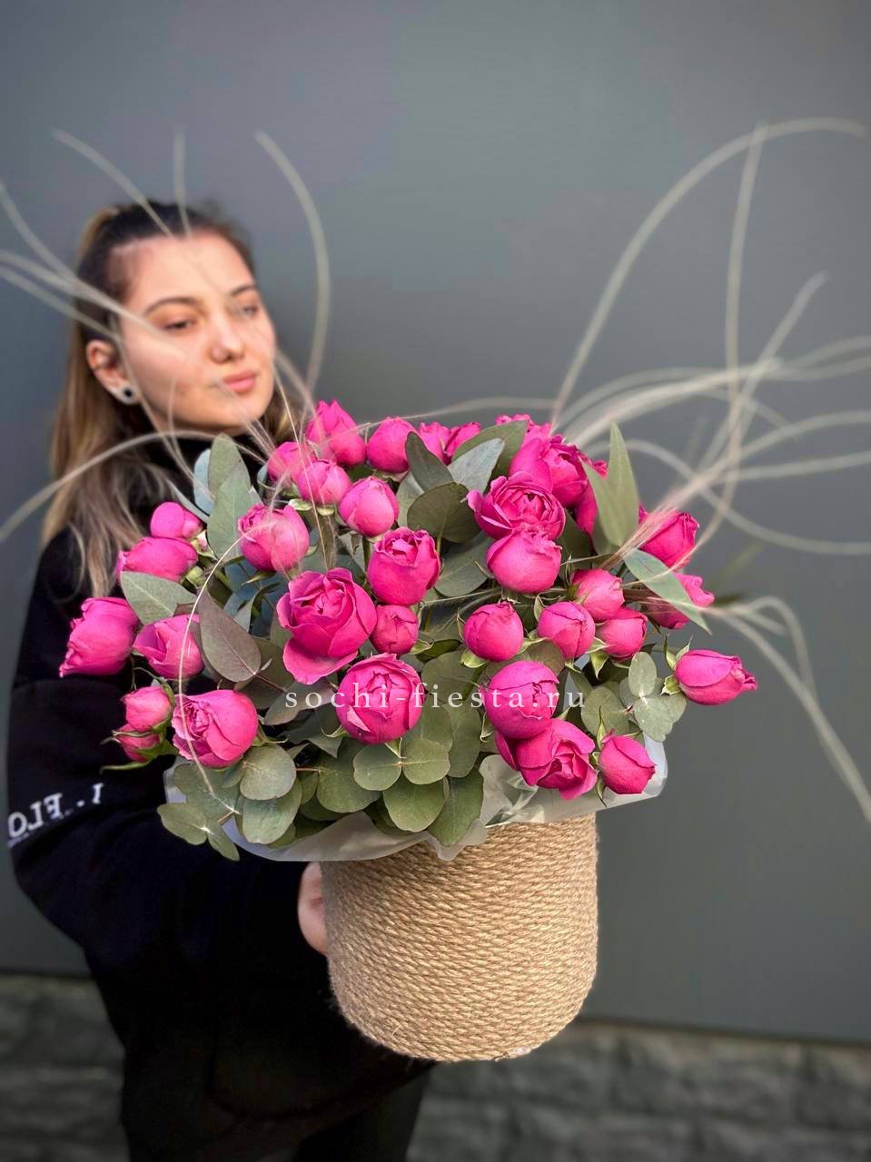 Воздушная гортензия окружает розы пудровых и снежных оттенков, а эвкалипт добавляет глубину и свежесть. Композиция собрана в натуральное джутовое кашпо, которое удобно разместить на столе или подоконнике.