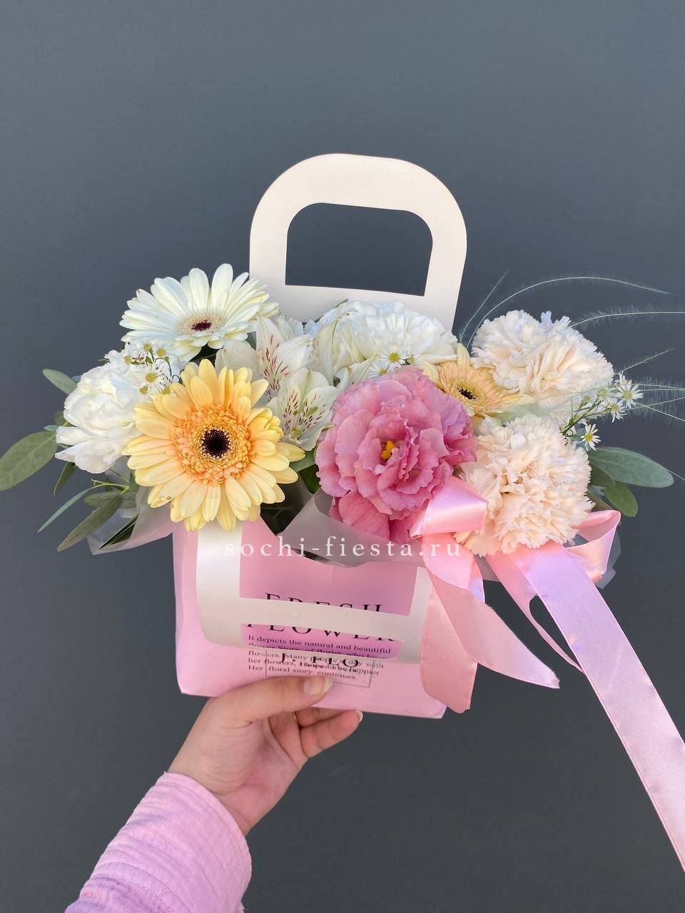 герберы, диантусы, альстромерии,  лента, эвкалипт,  сумка-кашпо.
