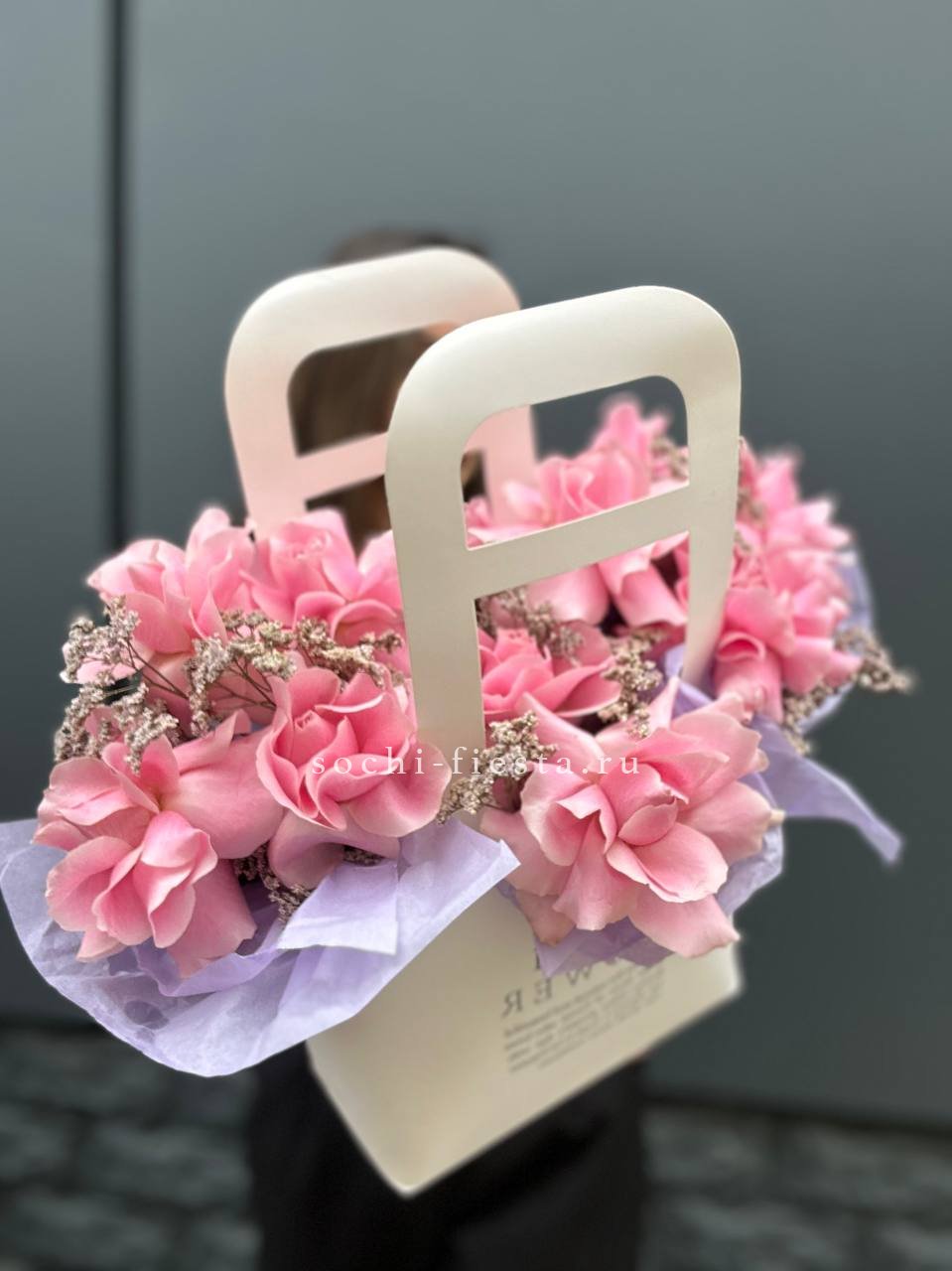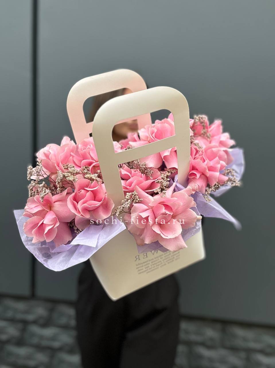 розовая роза, пионовидная роза, диантус, альсромерия, эвкалипт, лента, сумка.