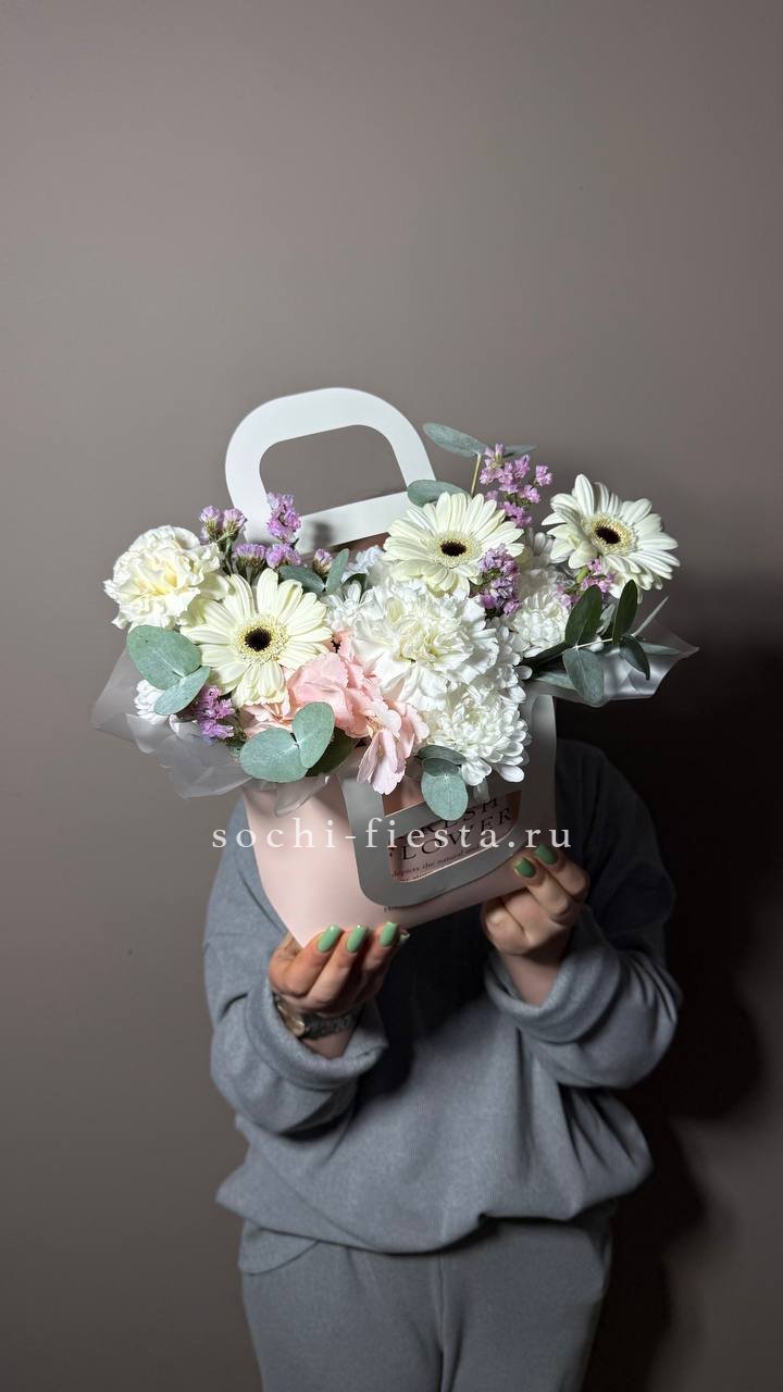 Розовые розы и пионовидные бутоны собраны в плотную композицию с диантусом и альстромерией. Эвкалипт задает ритм и добавляет свежести. Сумка California удобна для переноски и не требует дополнительной упаковки.