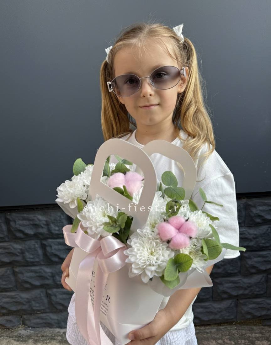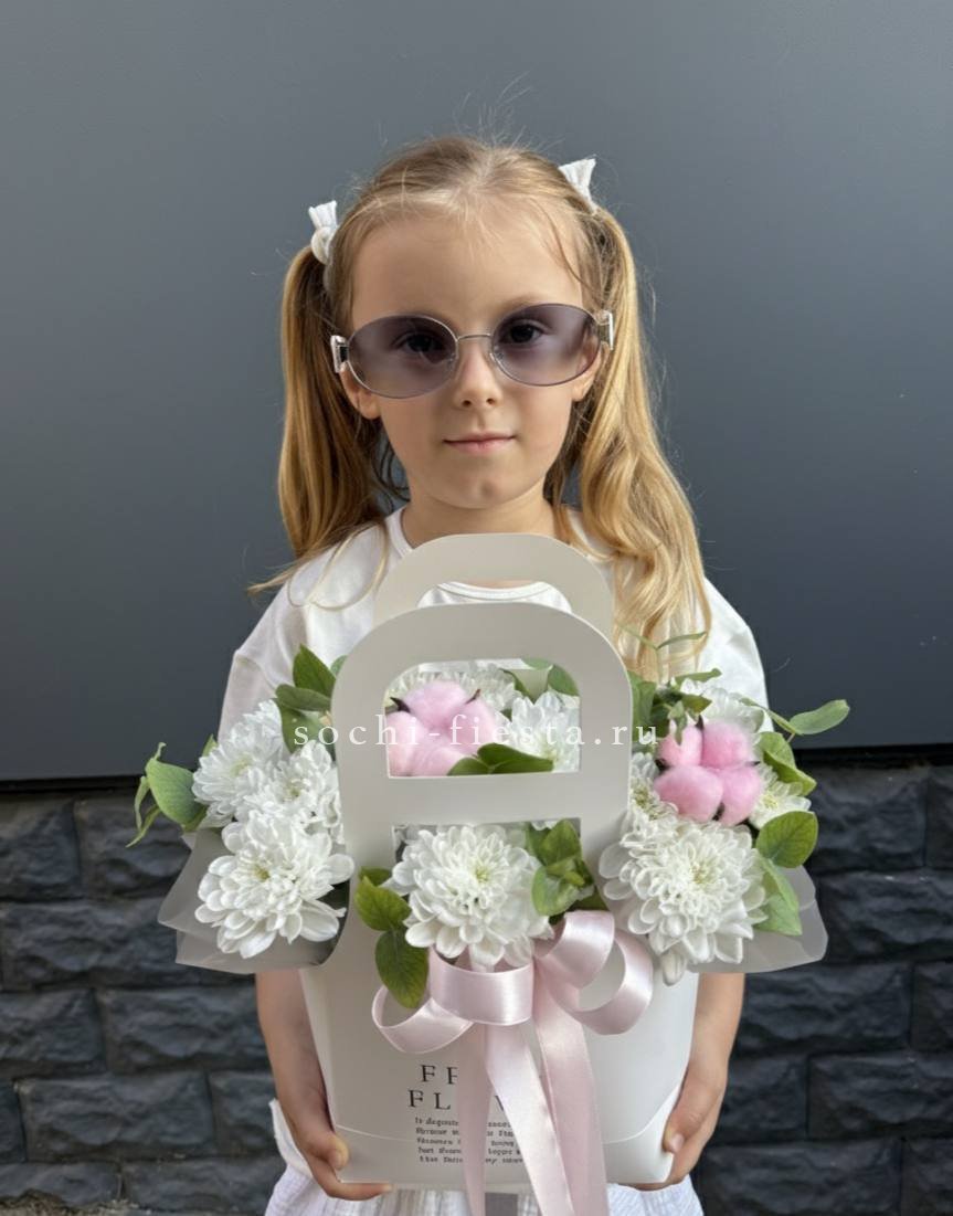 Воздушная композиция из диантусов и альстромерии в удобном формате. Цветы на оазисе держат свежесть долго и не требуют сложного ухода.