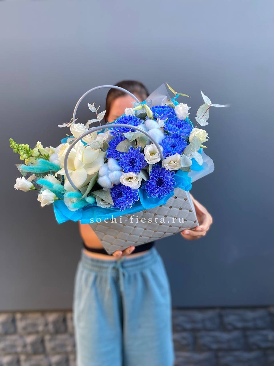 Герберы и маттиола вместе с диантусами выстраивают вертикальный ритм в flower bag. Белая роза и кустовая хризантема добавляют композиции завершенность.