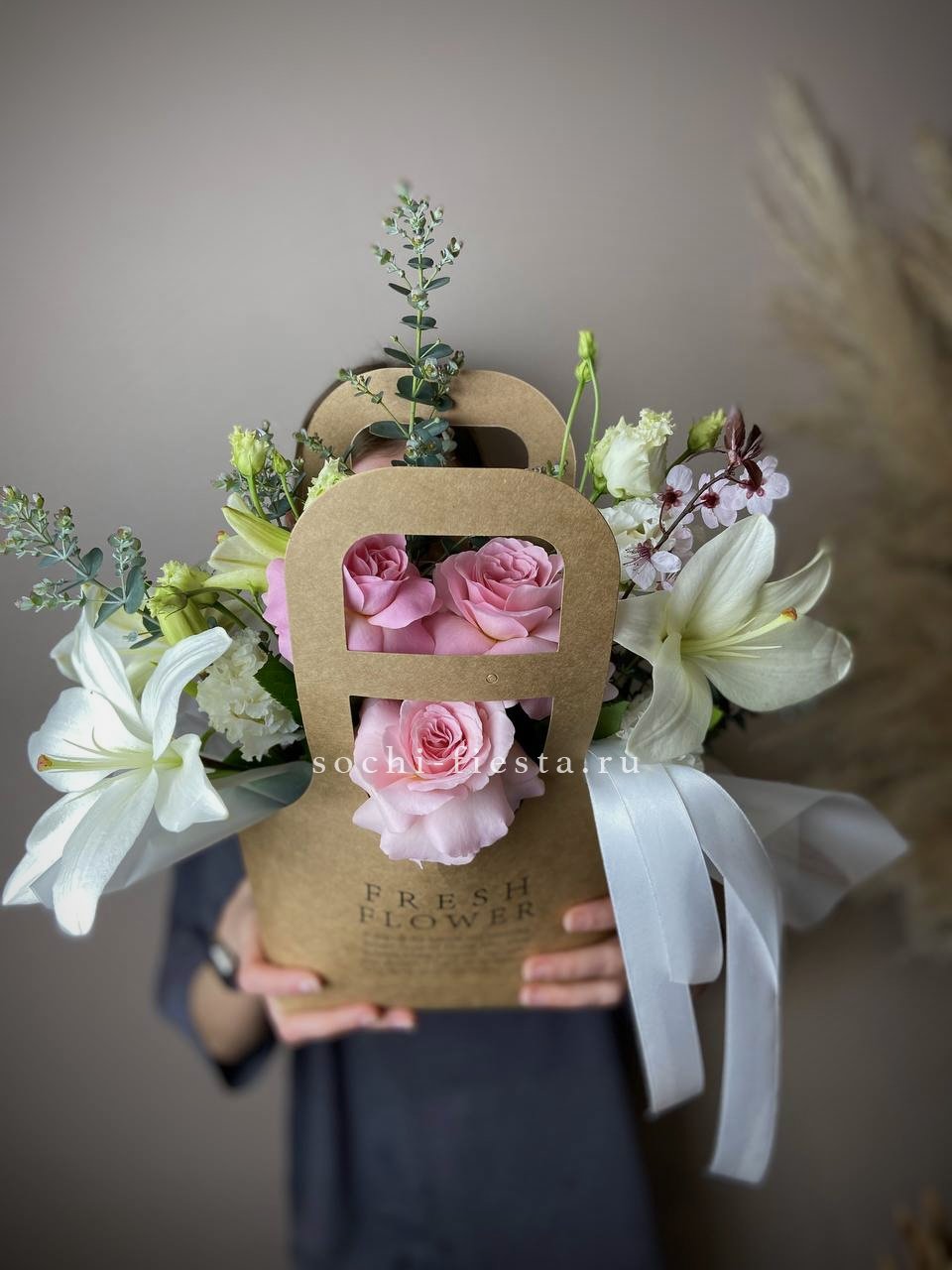 Белые и розовые розы образуют воздушную композицию с мягкими коробочками хлопка и лимониумом. Сумка-кашпо Sofi держит форму и позволяет разместить цветы на столе или полке. Букет выглядит аккуратно и остается свежим долгое время.