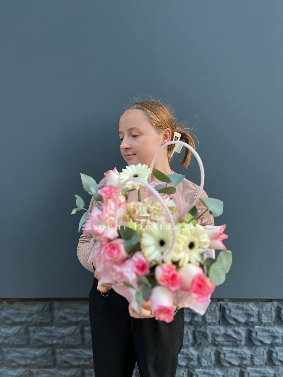 Гортензия и джумилия соседствуют с герберой в удобной сумочке. Разная плотность бутонов создает живую игру объемов и переходов от воздушного к плотному.