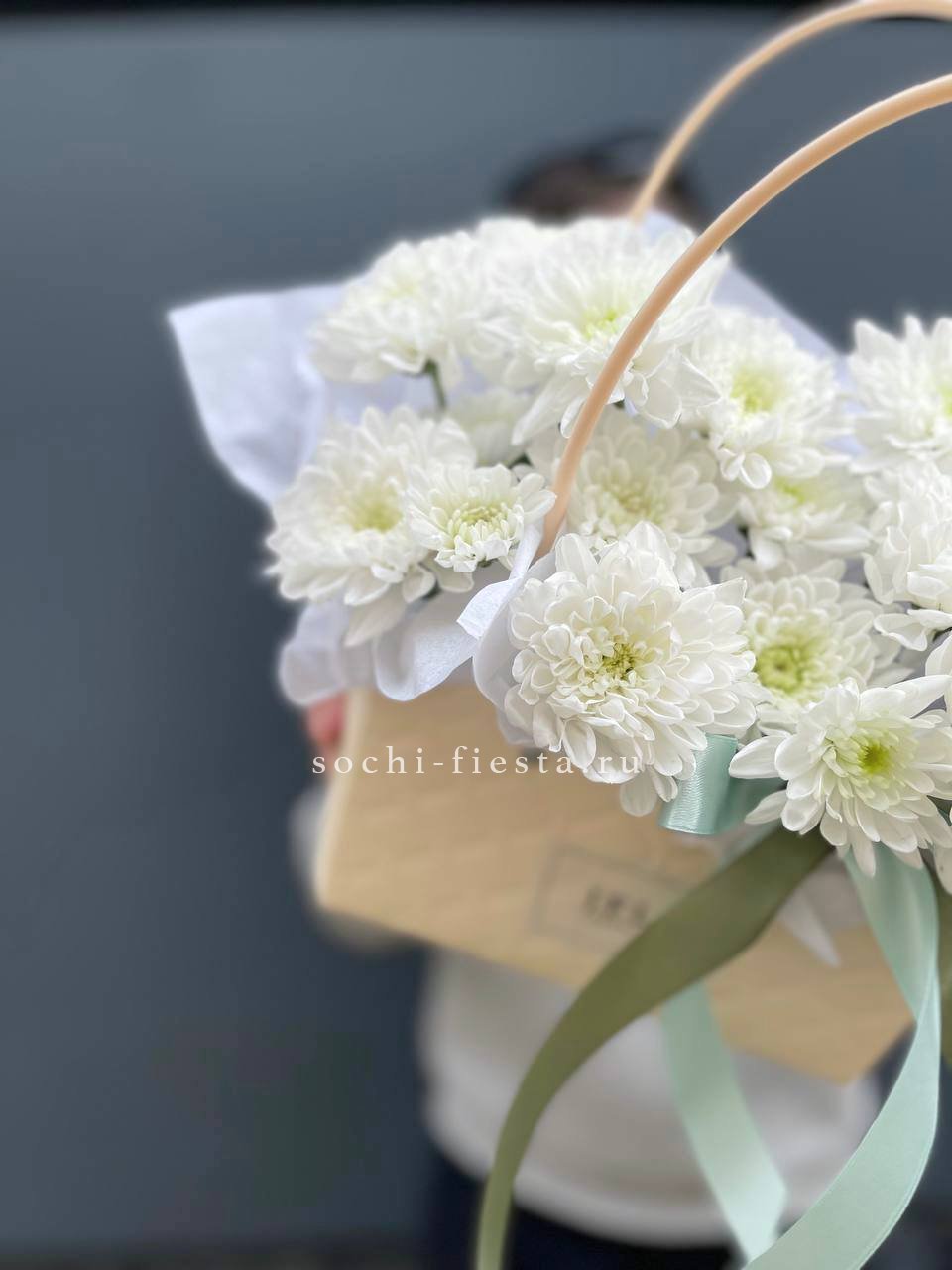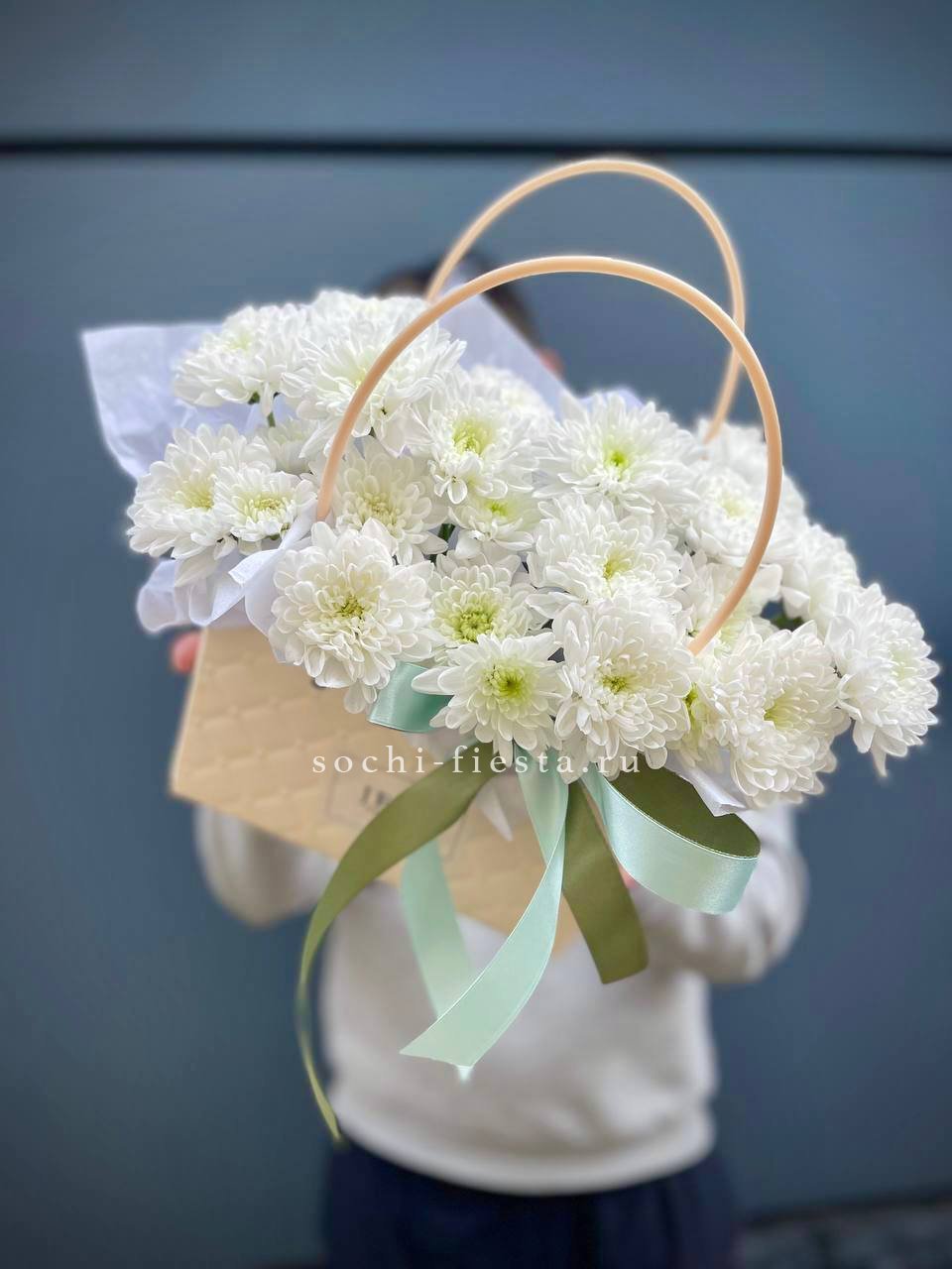 Голубая гортензия задаёт тон всей композиции, где хризантема и эустома создают объём, а хлопок с лагурусом добавляют воздушности. Сумочка вмещает насыщенную палитру без перегруженности.
