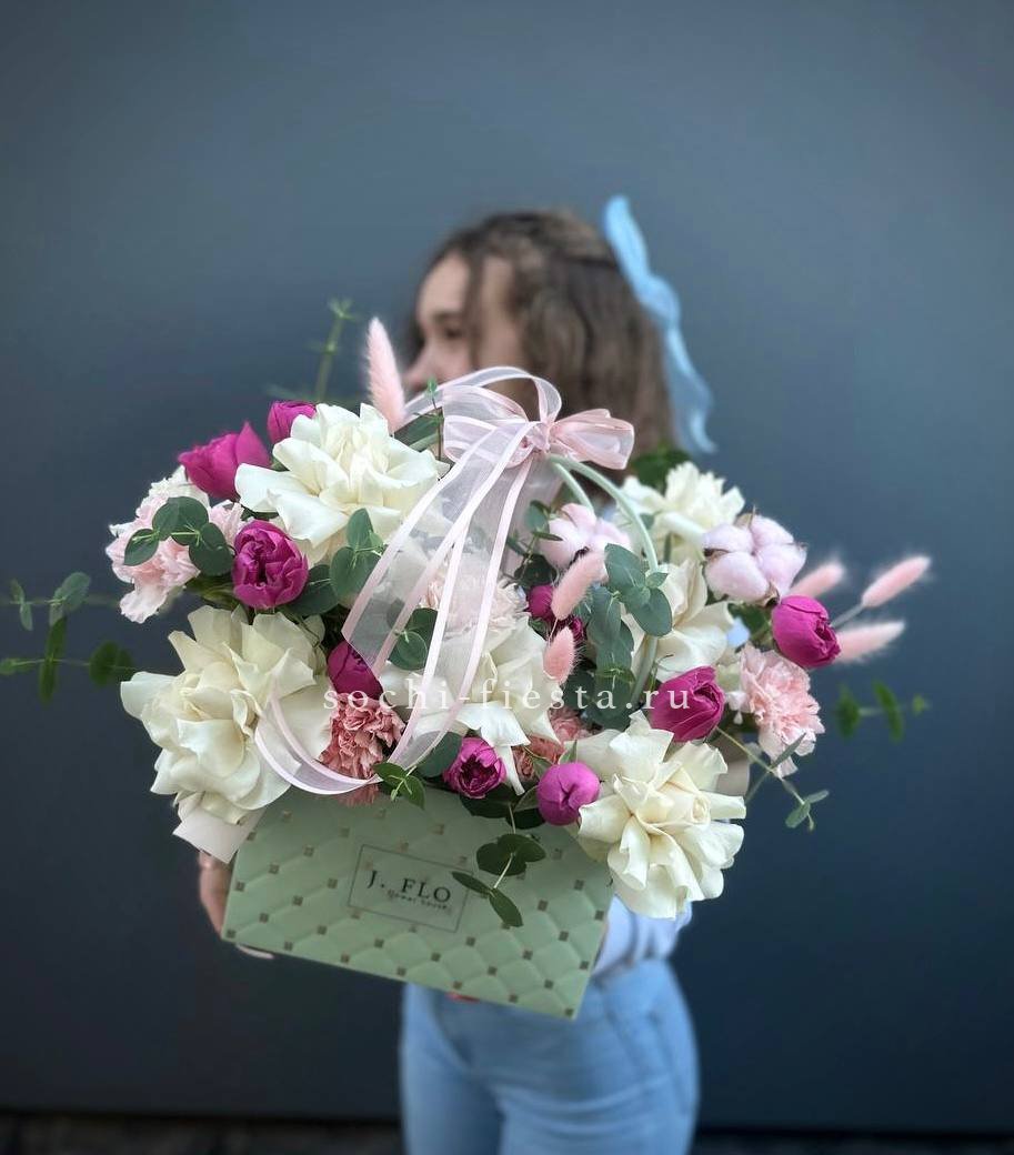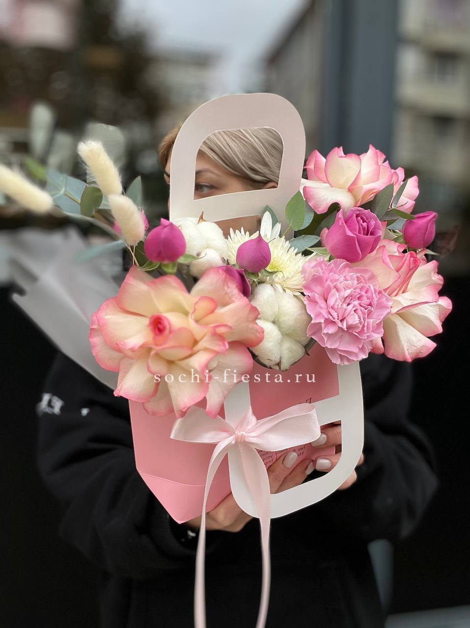 Яркая композиция в удобной сумочке объединяет розы Джумилия с герберами и воздушными соцветиями. Хлопок и лагурус добавляют природной легкости, а диантус создает цветовую динамику.