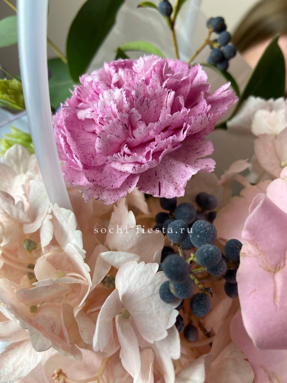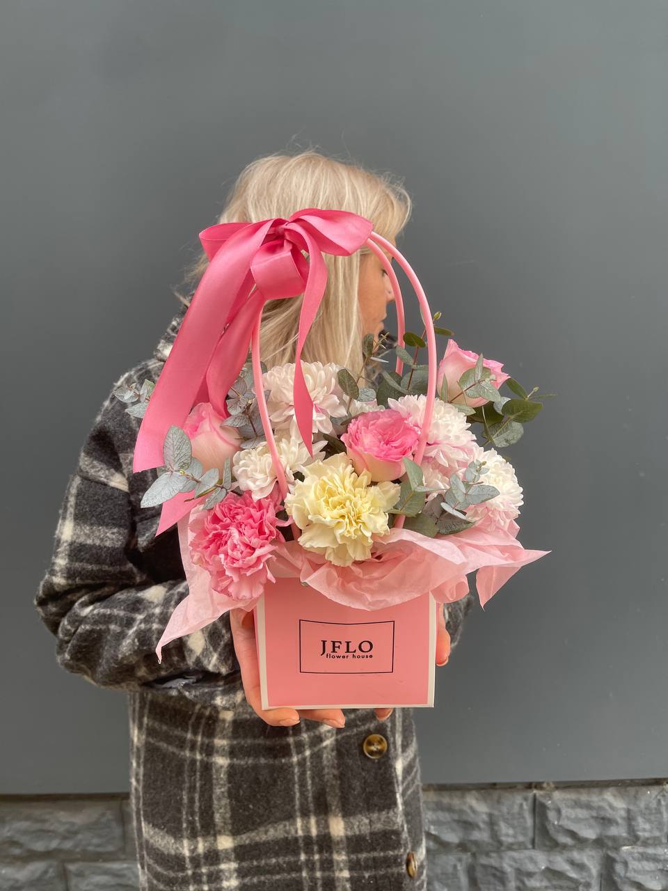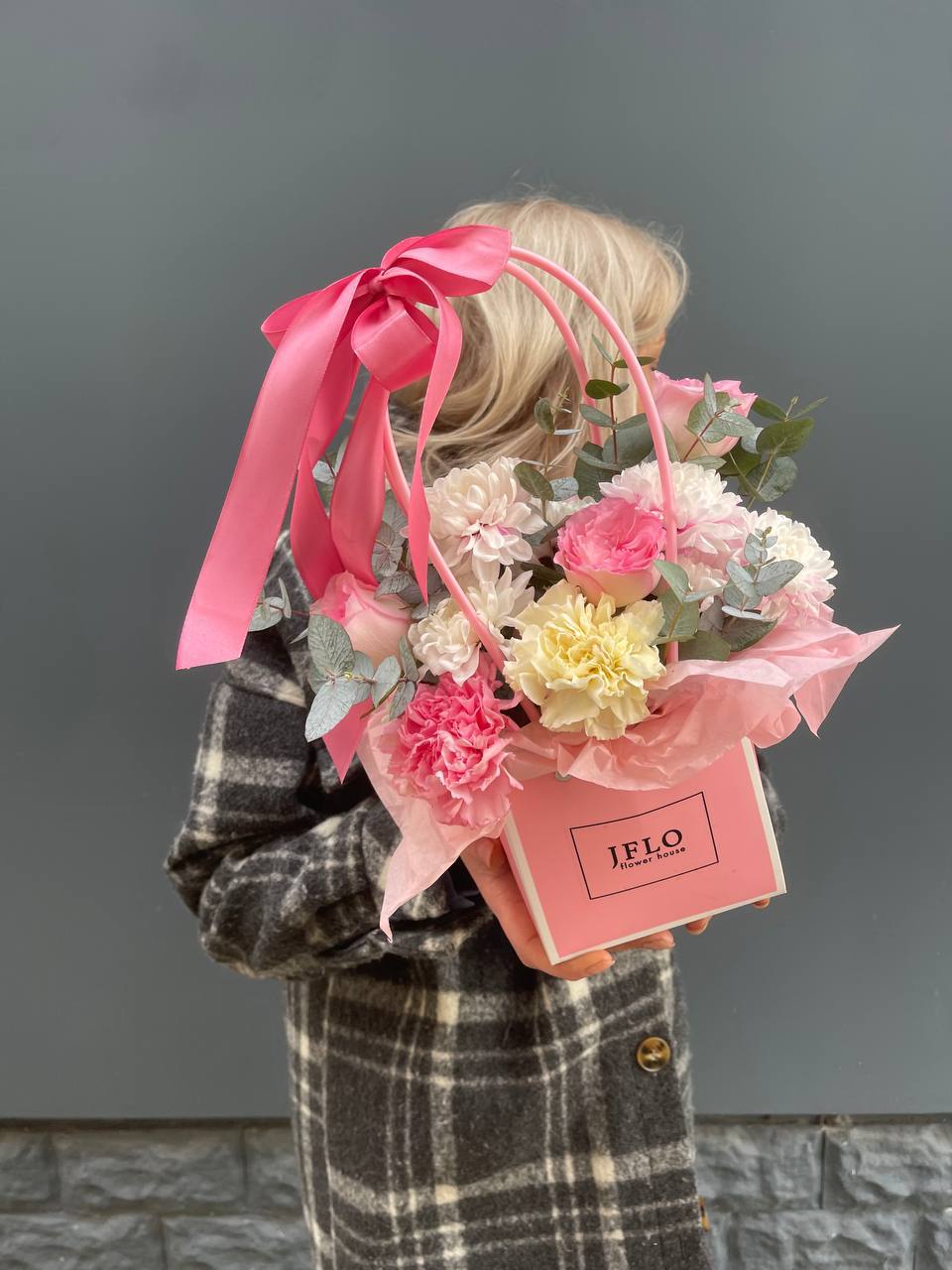 Воплощение изысканности и тренда! Эта стильная композиция в розовой сумочке объединяет в себе яркие цветовые акценты и современный флористический дизайн. Она идеально подойдет для модного образа или в качестве креативного подарка для ценителей необычных решений. Безупречный вкус в каждой детали.