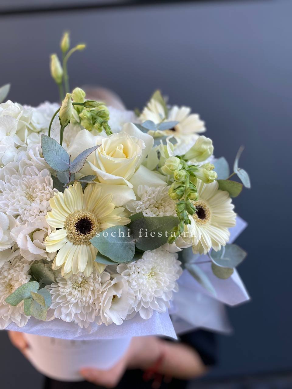 гортензия, роза, гербера, хризантема, эустома, антиринум, бокс 16.