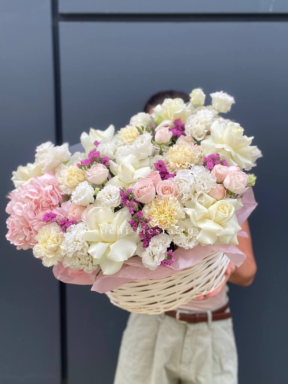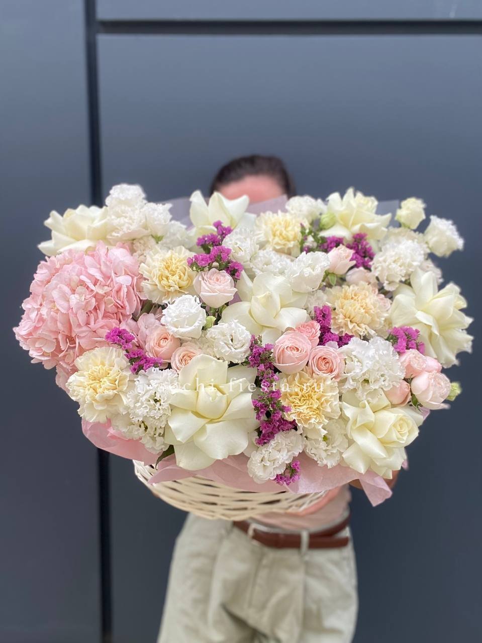 гортензия, эустома, диантус, роза, бомбастик, статица или аналог, корзина.