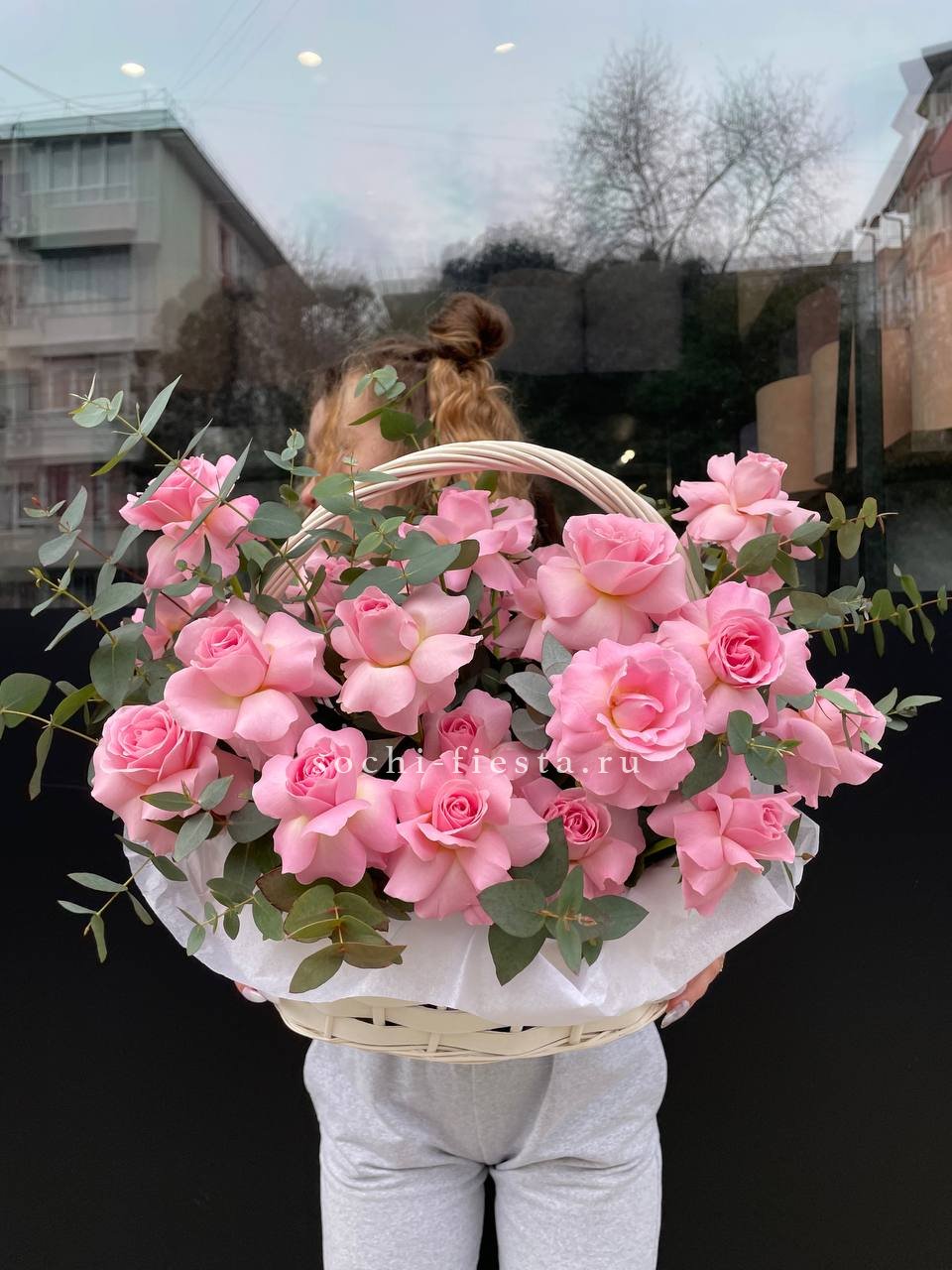гортензия, эустома, розы, маттиола (дельфиниум или аналоги), кустовые розы, лента, корзина D40