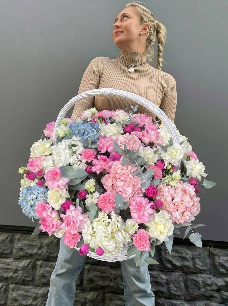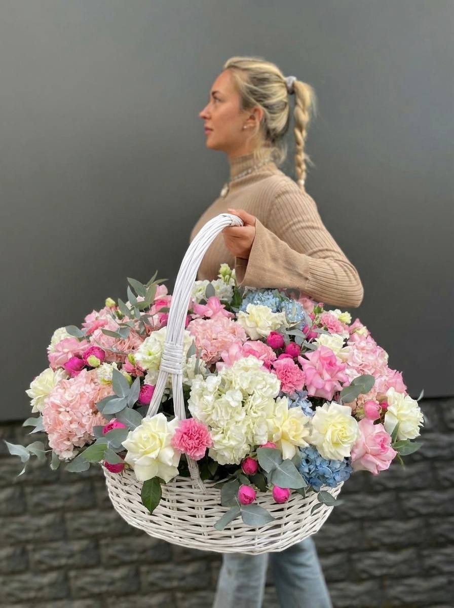 Плотная россыпь бутонов в плетеной корзине создает живописную композицию с переходами от сиреневых до пудровых оттенков. Гортензия и маттиола задают воздушный объем, а розы разной раскрытости добавляют глубину и многослойность всей картине.
