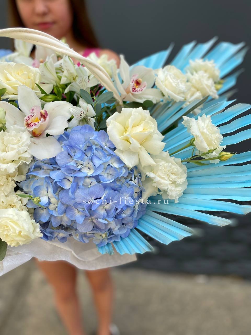 Корзина с орхидеями и гортензией раскрывается объёмной шапкой соцветий. Синие и белые оттенки перетекают друг в друга, создавая живописную композицию. Такое оформление удобно переносить и сразу размещать на столе.