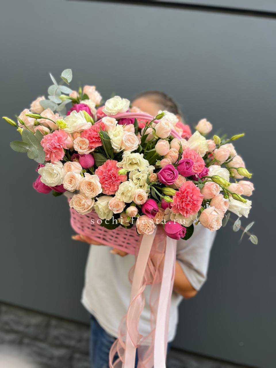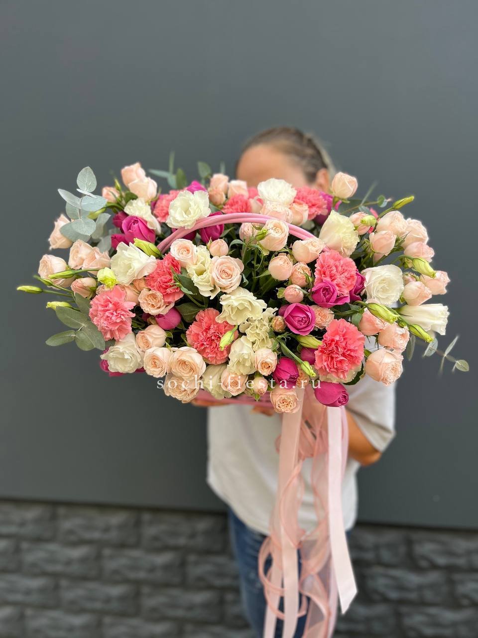 орхидея, гортензия, эустома, роза, эвкалипт, альстромерия, лента, корзина.