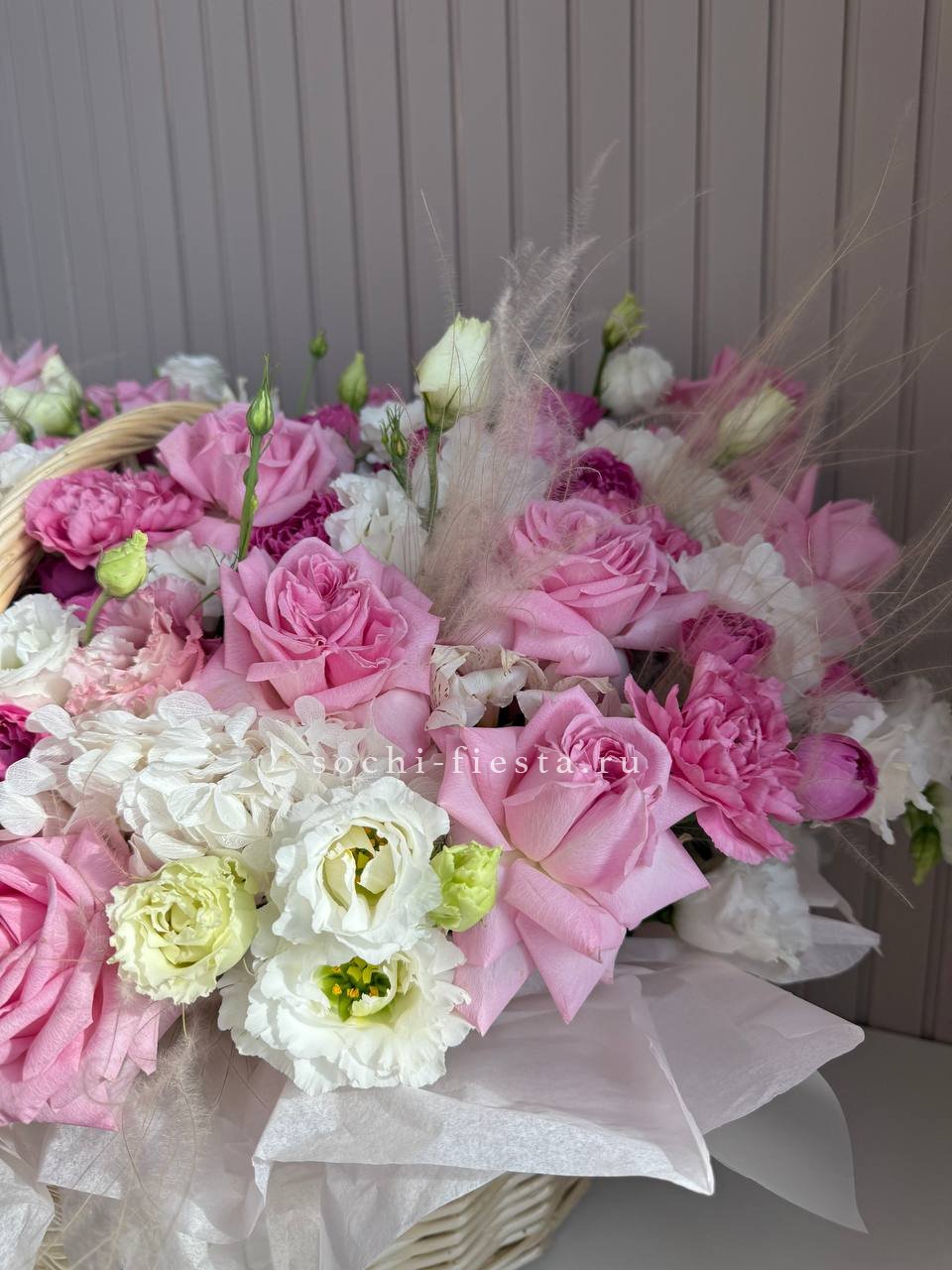 роза одноголовая, роза пионовидная, альстромерия, эустома, гортензия, ковыль, диантус, плетеная корзина.