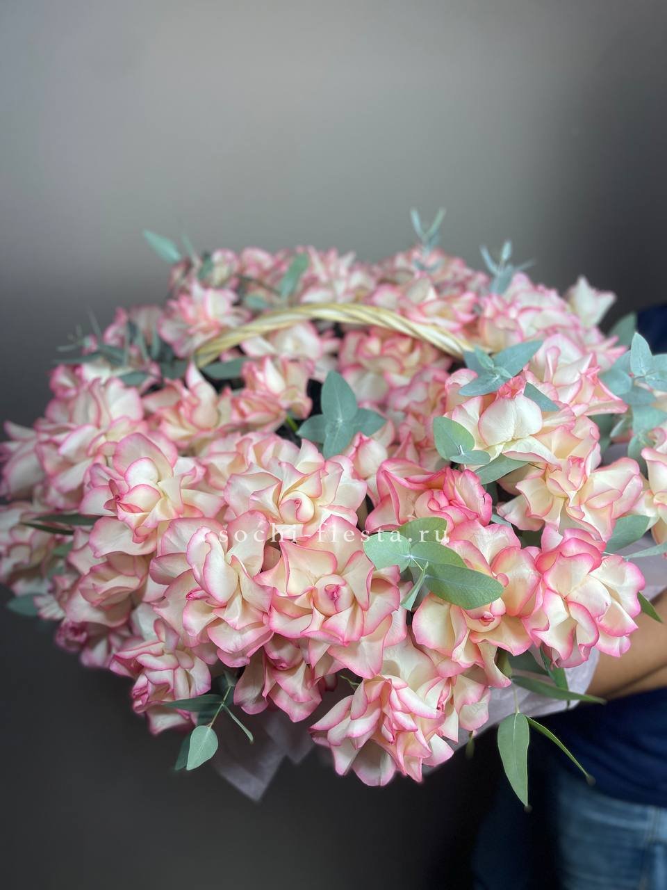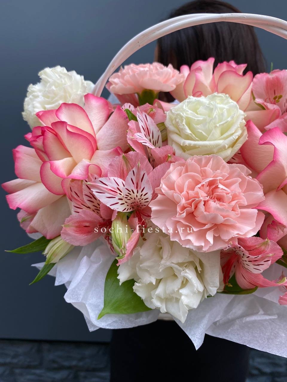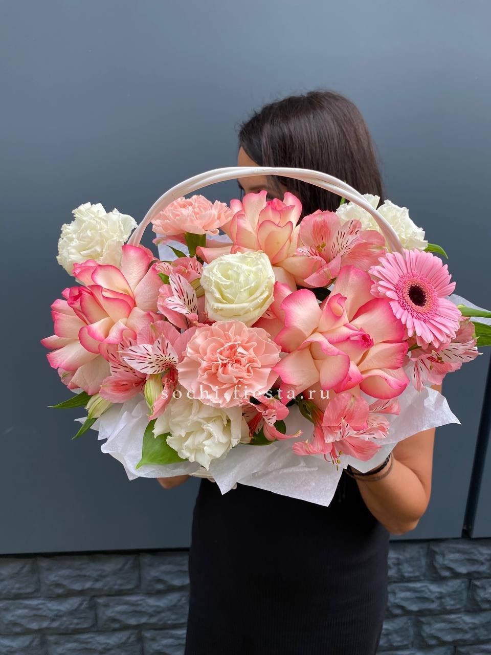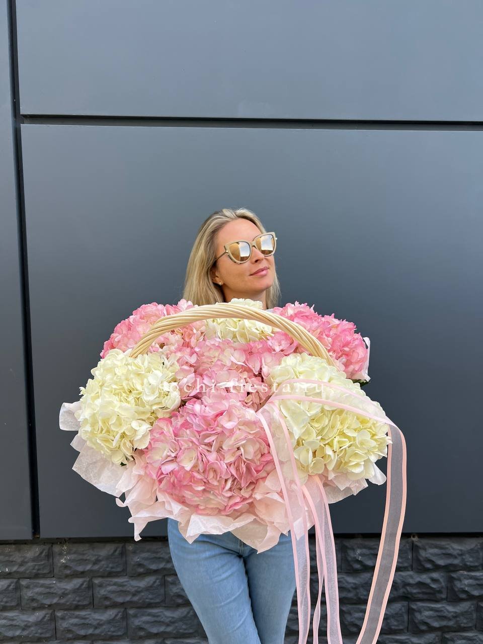 Гортензия и эустома задают объём, а яркие герберы расставляют цветовые акценты по всей композиции. Диантус и хайди добавляют воздушности, эвкалипт завершает силуэт мягкими линиями. Корзина держит форму и создаёт устойчивую основу для пышной композиции.