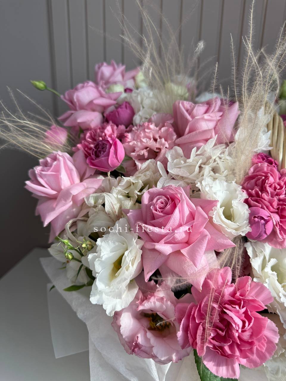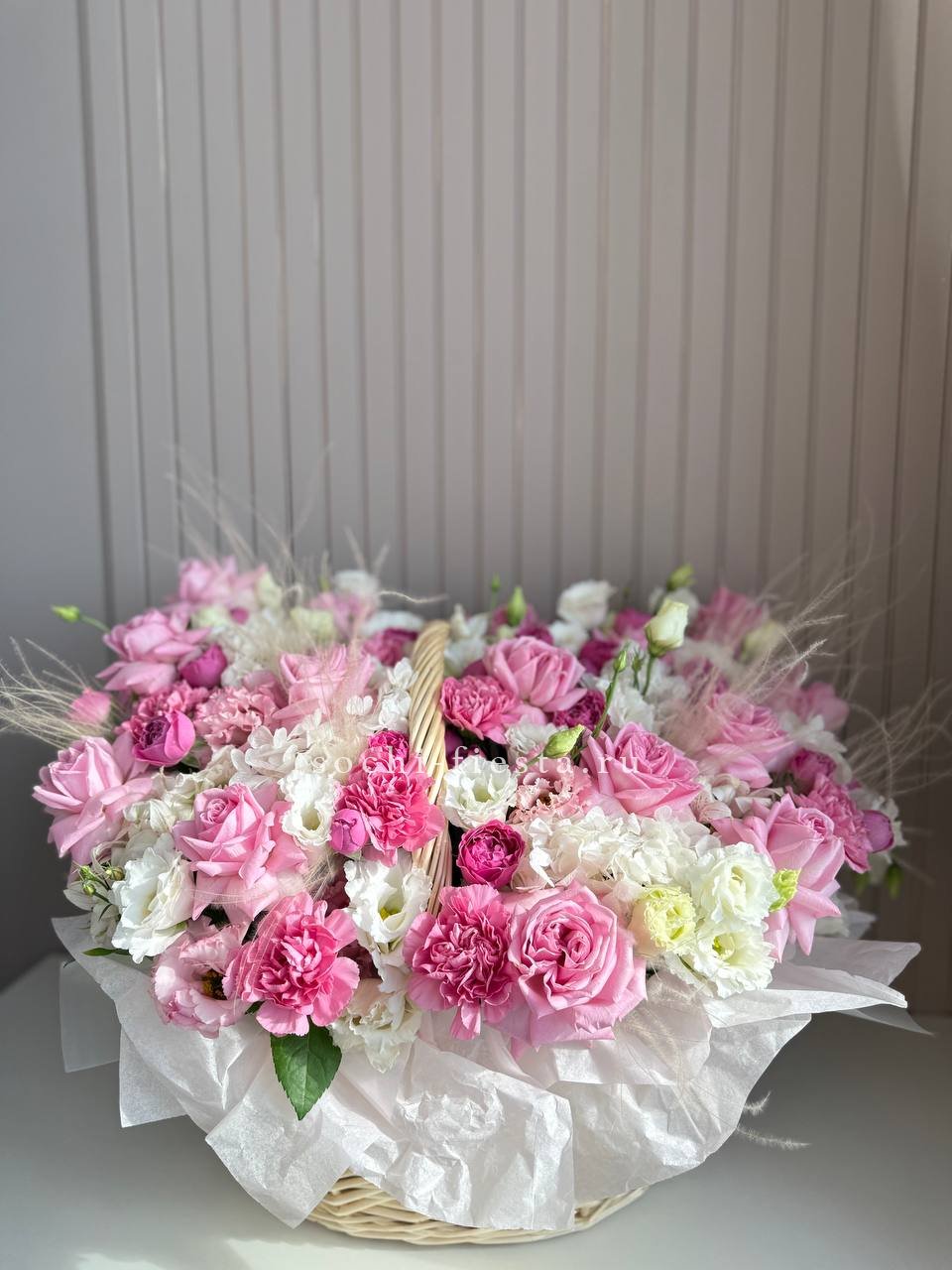 Пышные пионовидные розы Мисти Баблс и бомбастик создают объёмное облако в естественной плетёной корзине. Диантусы и статица добавляют воздушности, а эвкалипт завершает композицию свежими нотами. Яркое присутствие в любом пространстве.