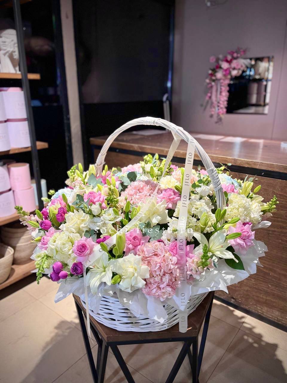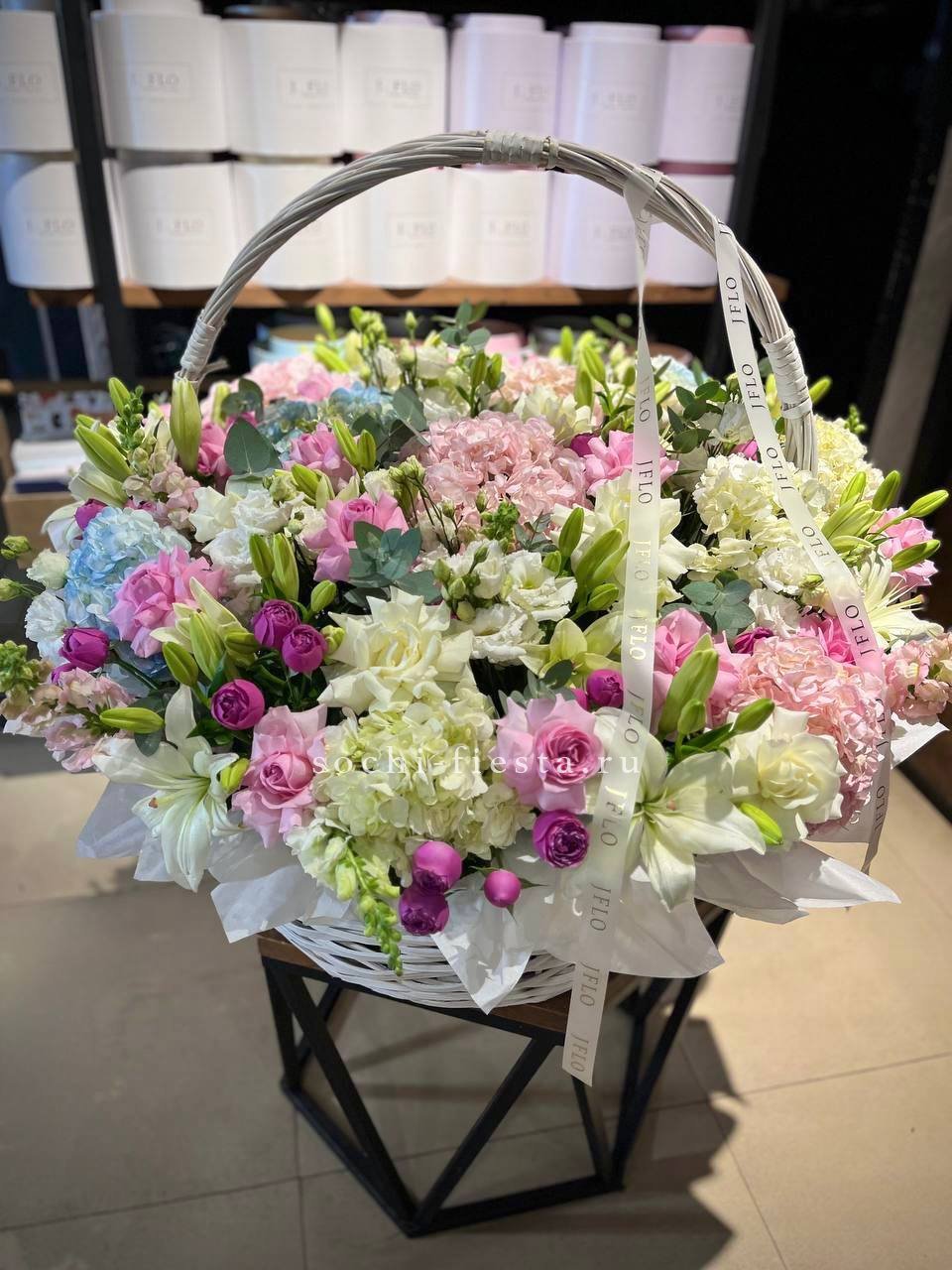 гортензии, пионы, лента, светлая корзина D30.