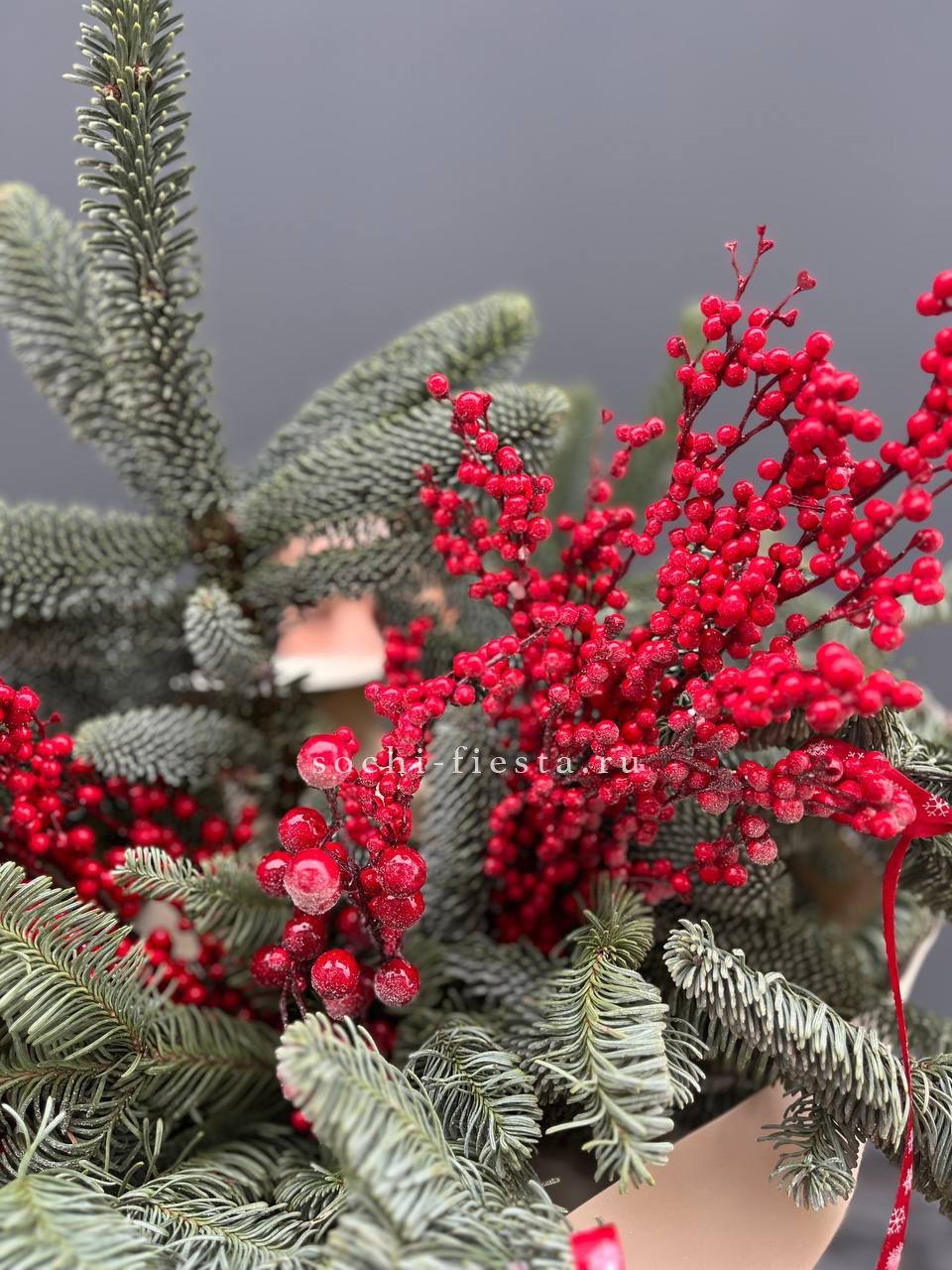 Живые ветви нобилиса переплетаются с красными ягодами илекса. Вертикальная сборка создаёт ритм между хвойной зеленью и ягодными гроздьями. Букет держит форму и долго сохраняет свежесть.