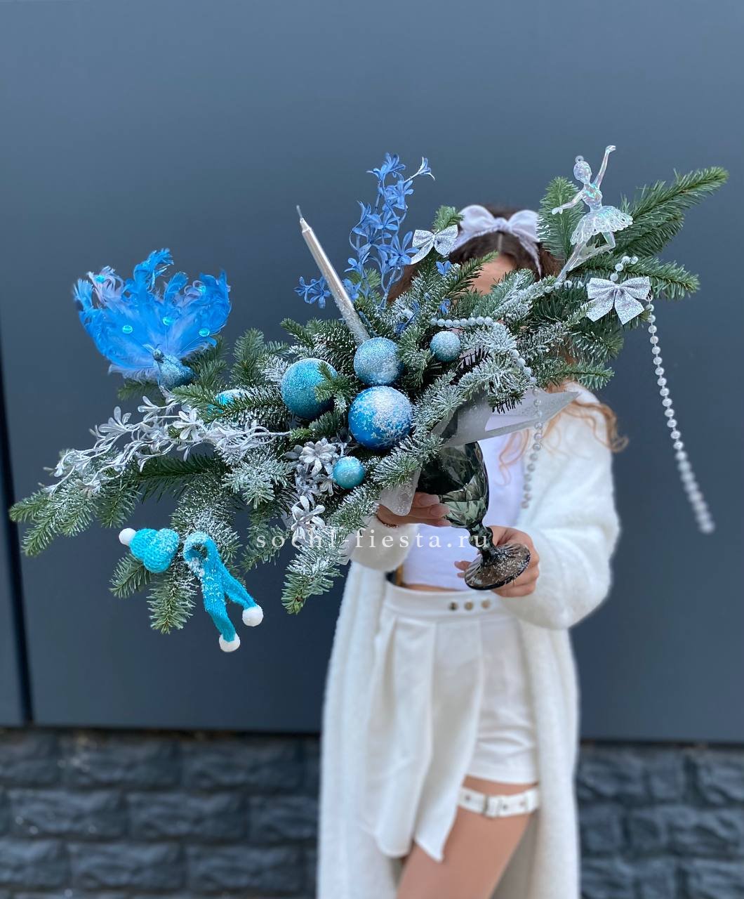 Голубые оттенки декора в сочетании с зеленью нобилиса раскрывают морозную палитру зимы. Свеча в прозрачном бокале добавляет лёгкости и света небольшой настольной форме.