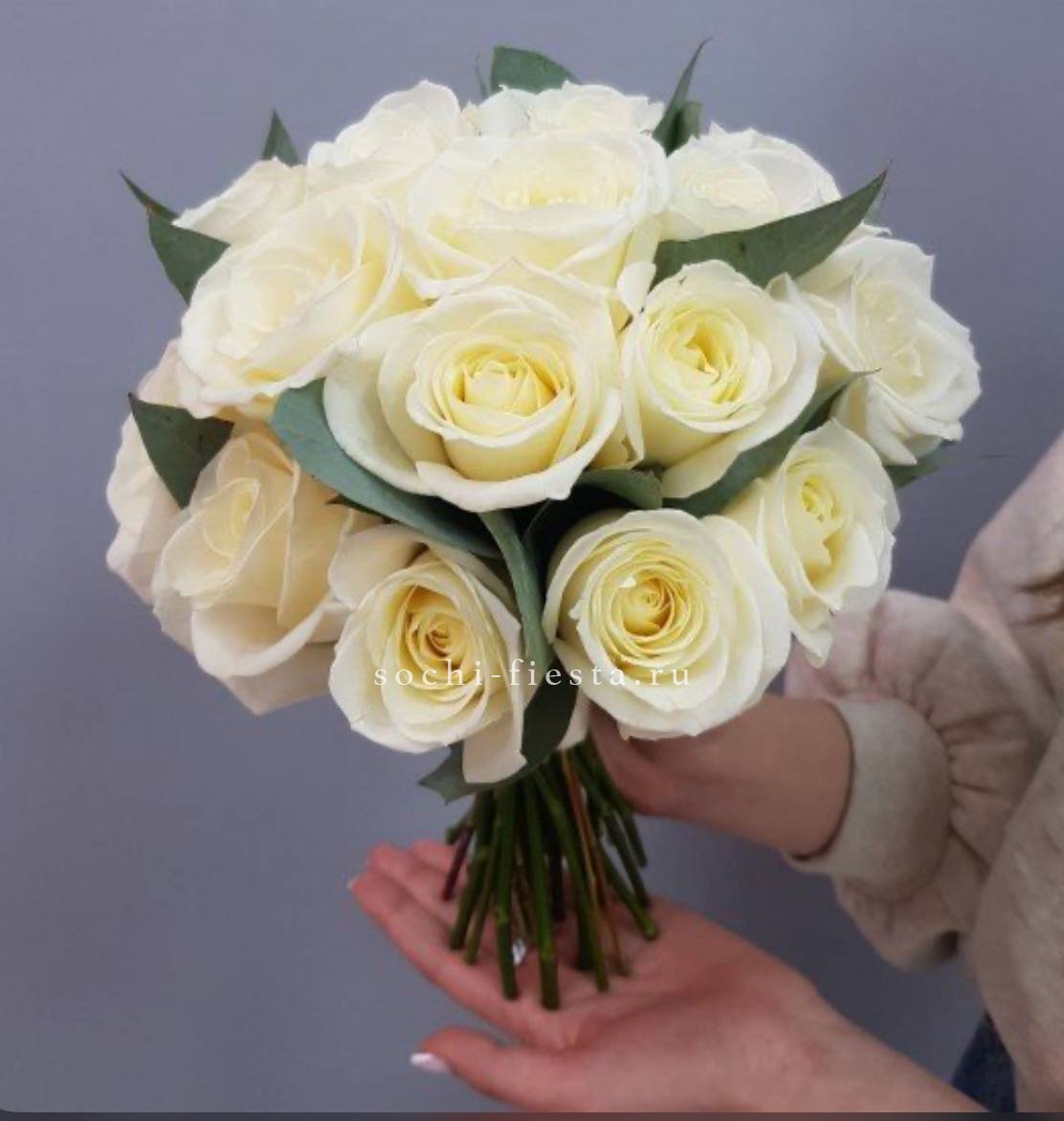 Белоснежная композиция с махровыми соцветиями эустомы и классическими розами. Сезонные детали и зелень образуют естественный рисунок без лишней строгости.