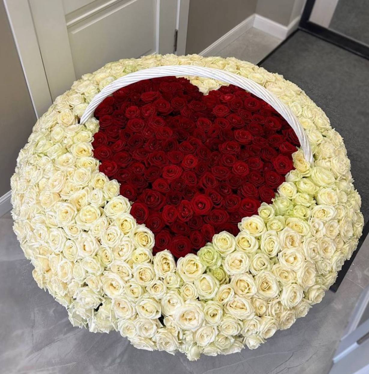 Пятьсот одна роза образует форму сердца из белых и красных бутонов. Плотная композиция в корзине удерживает симметрию и объём без дополнительных конструкций. Готовое решение для выражения чувств в масштабной форме.