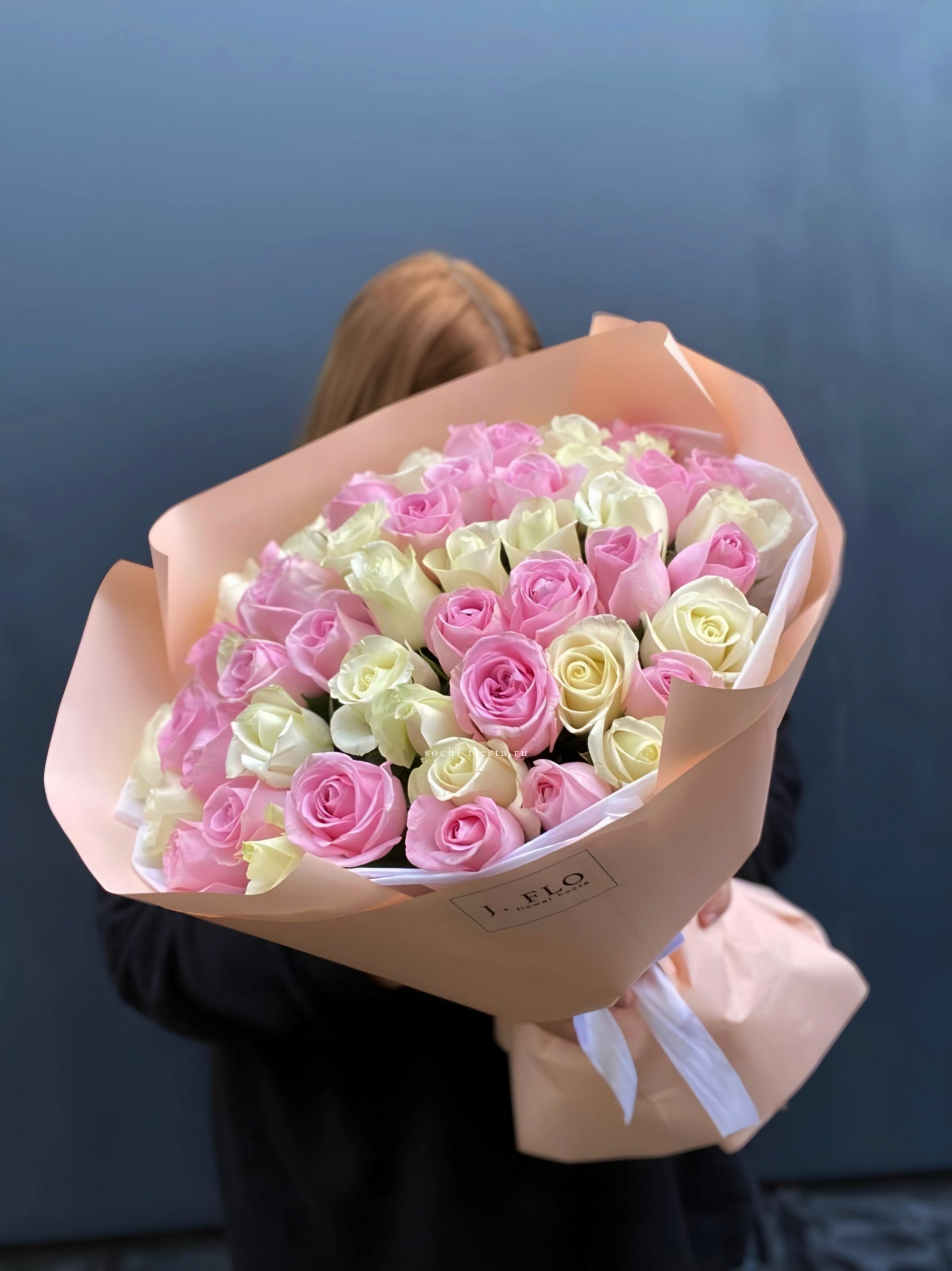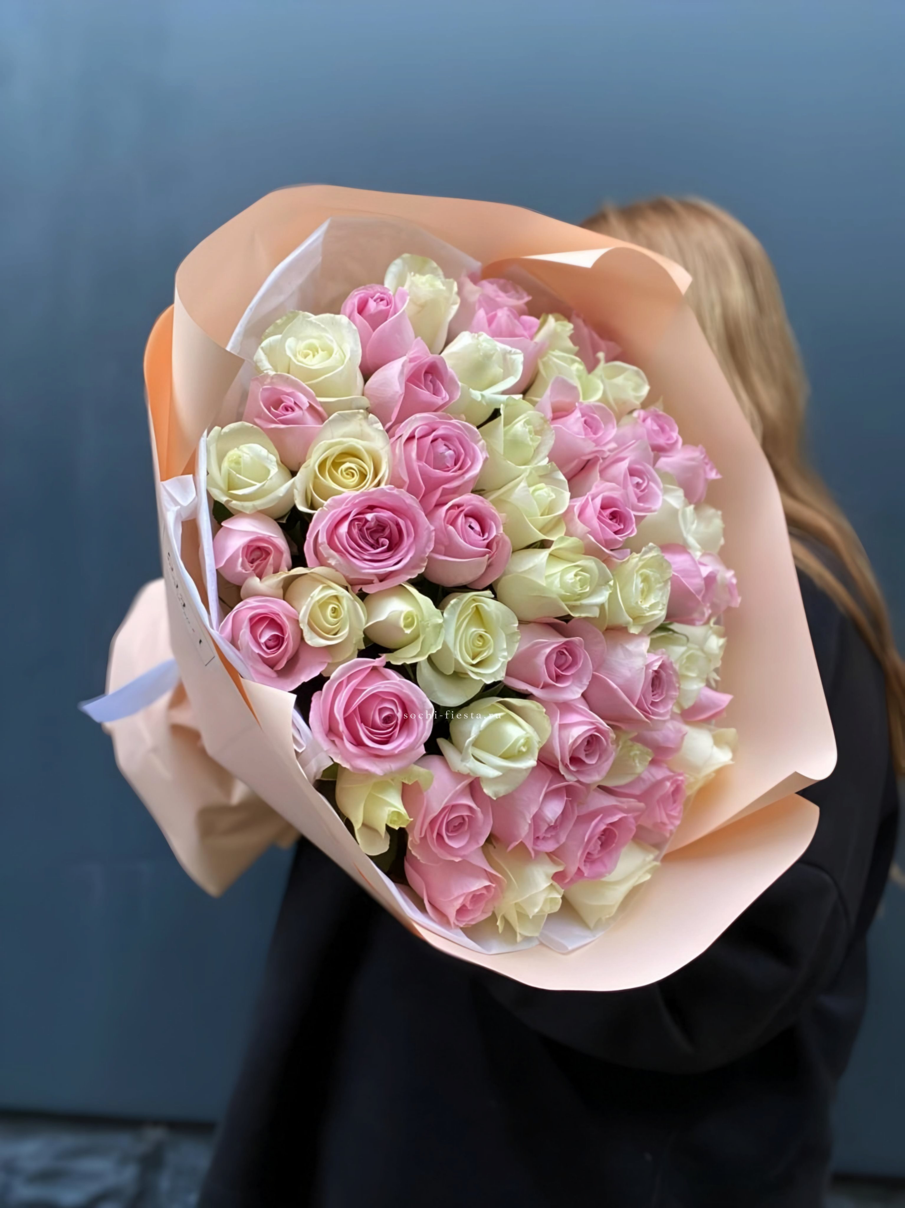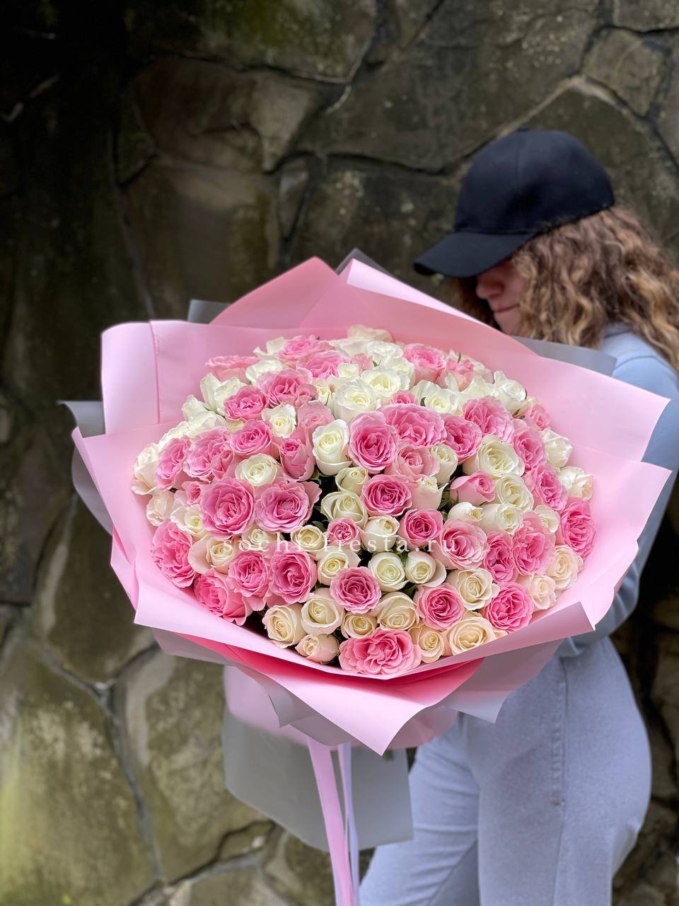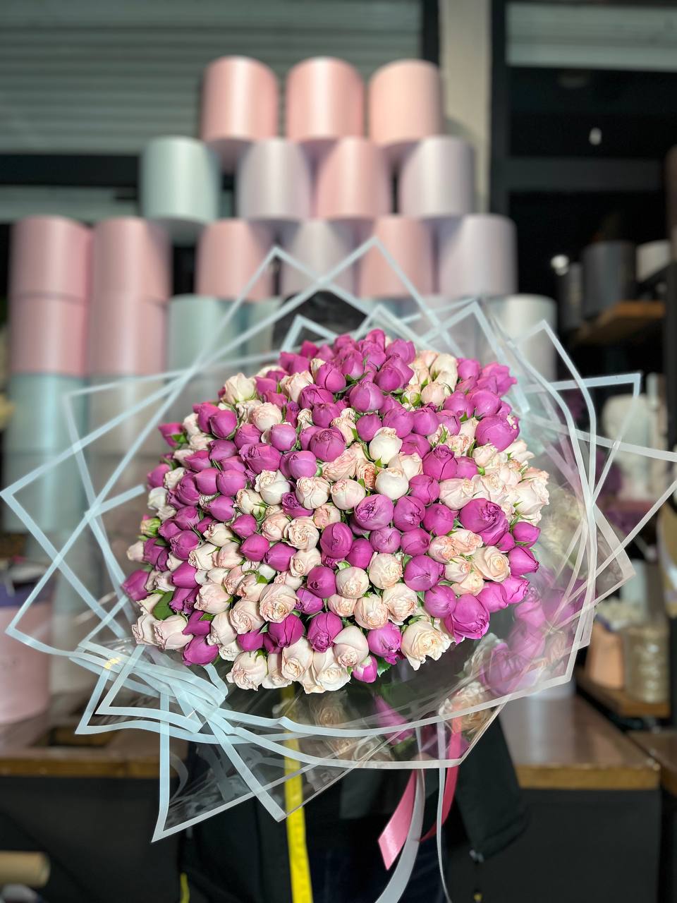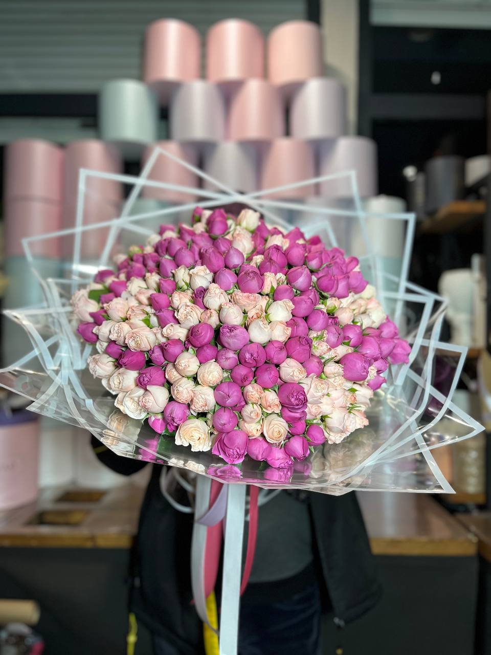 Сто один бутон в бело-розовой палитре создают объёмное облако цвета. Композиция впечатляет масштабом и наполняет пространство мягким сиянием лепестков.