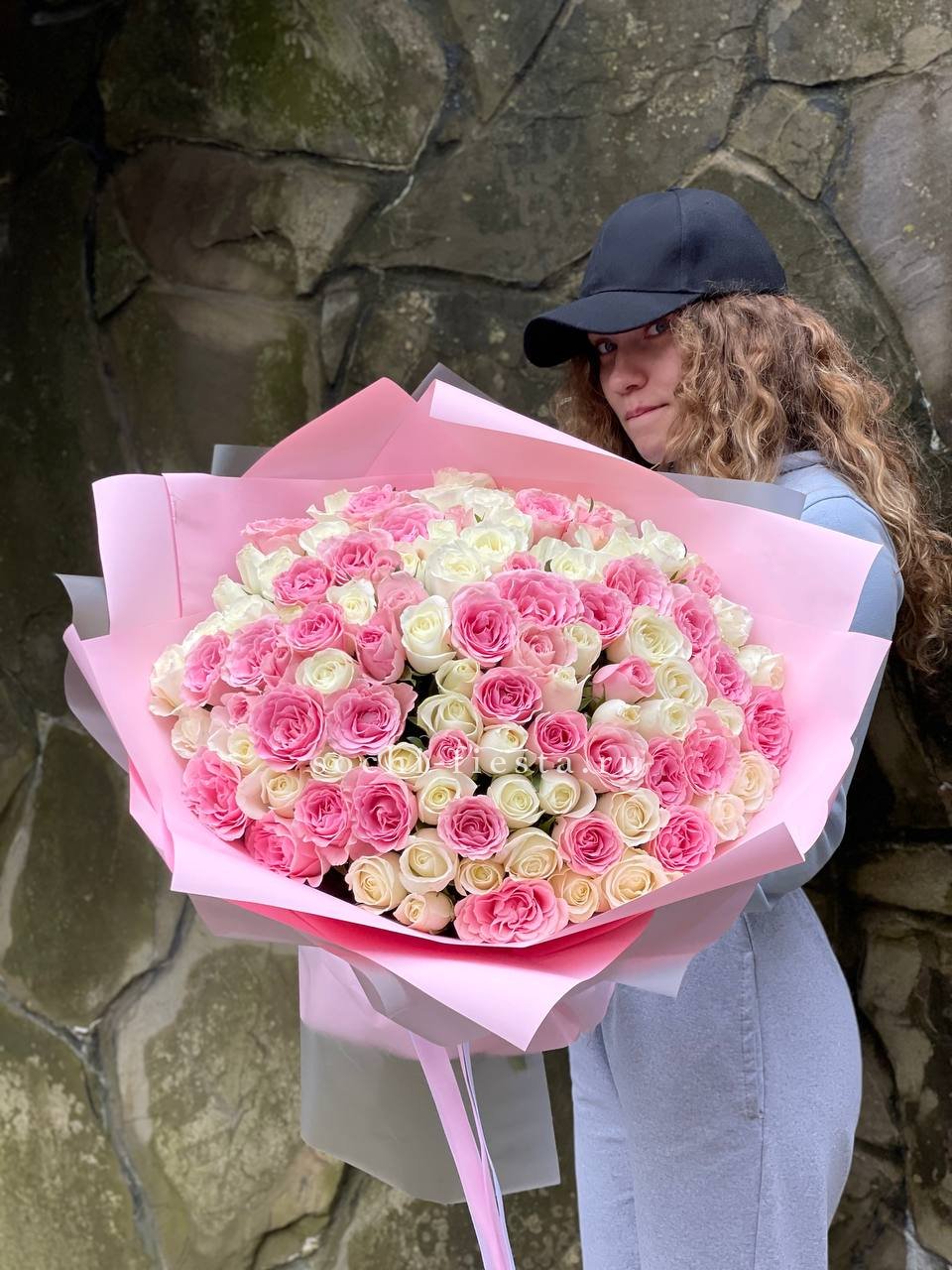 101 белая и розовая роза, лента.