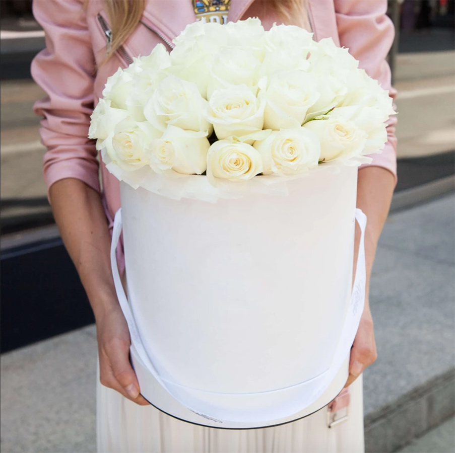 Белые розы собраны в плотную округлую форму с ровным силуэтом. Дизайнерская упаковка подчёркивает графичность линий и создаёт завершённую композицию. Букет с выразительным присутствием.