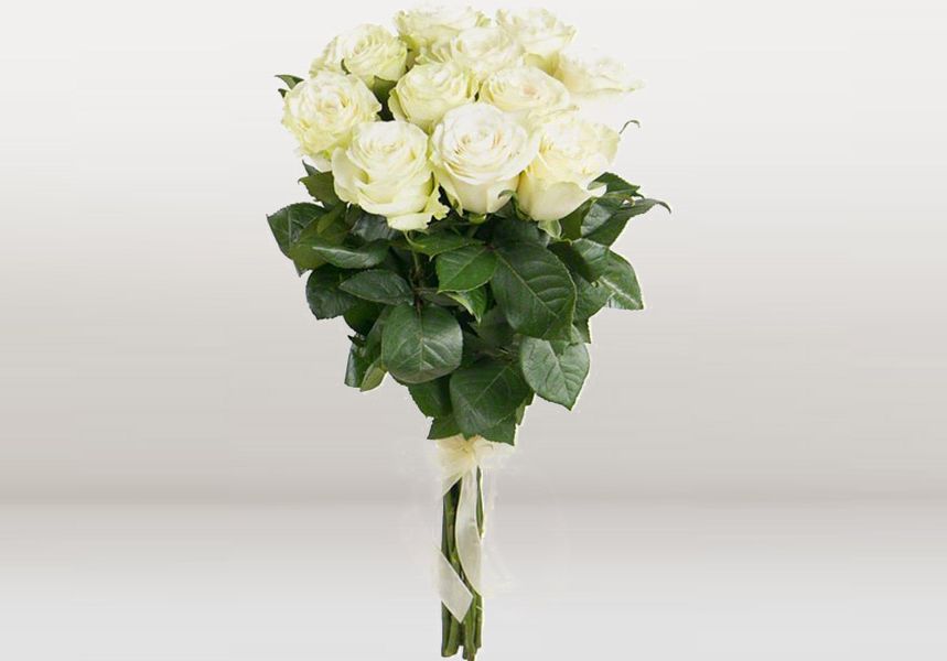 Пятнадцать белоснежных роз собраны в аккуратную форму с ровным силуэтом. Композиция сохраняет свежесть и держит структуру благодаря продуманному размещению бутонов в цилиндре.