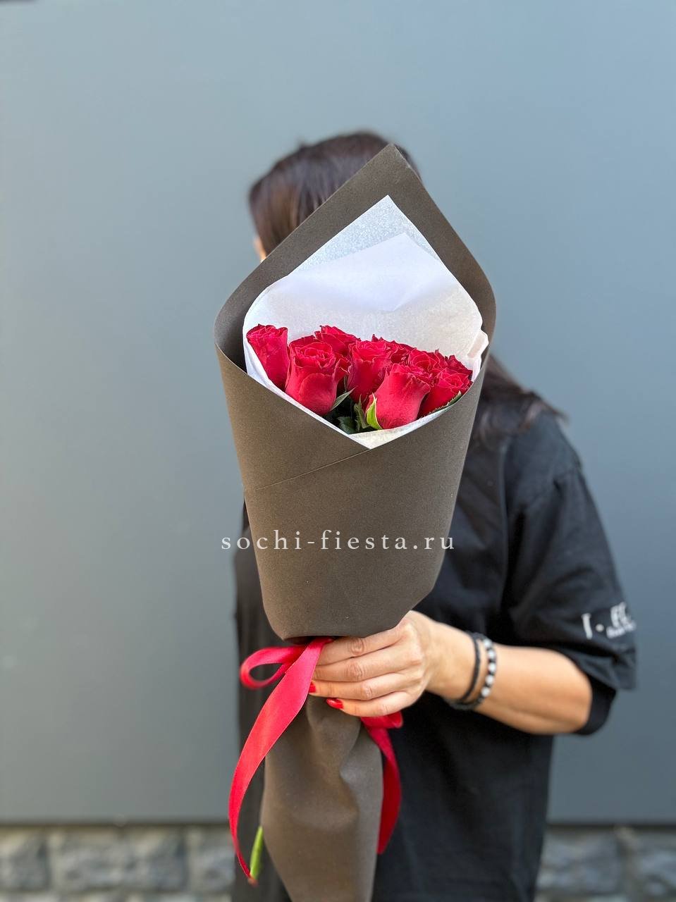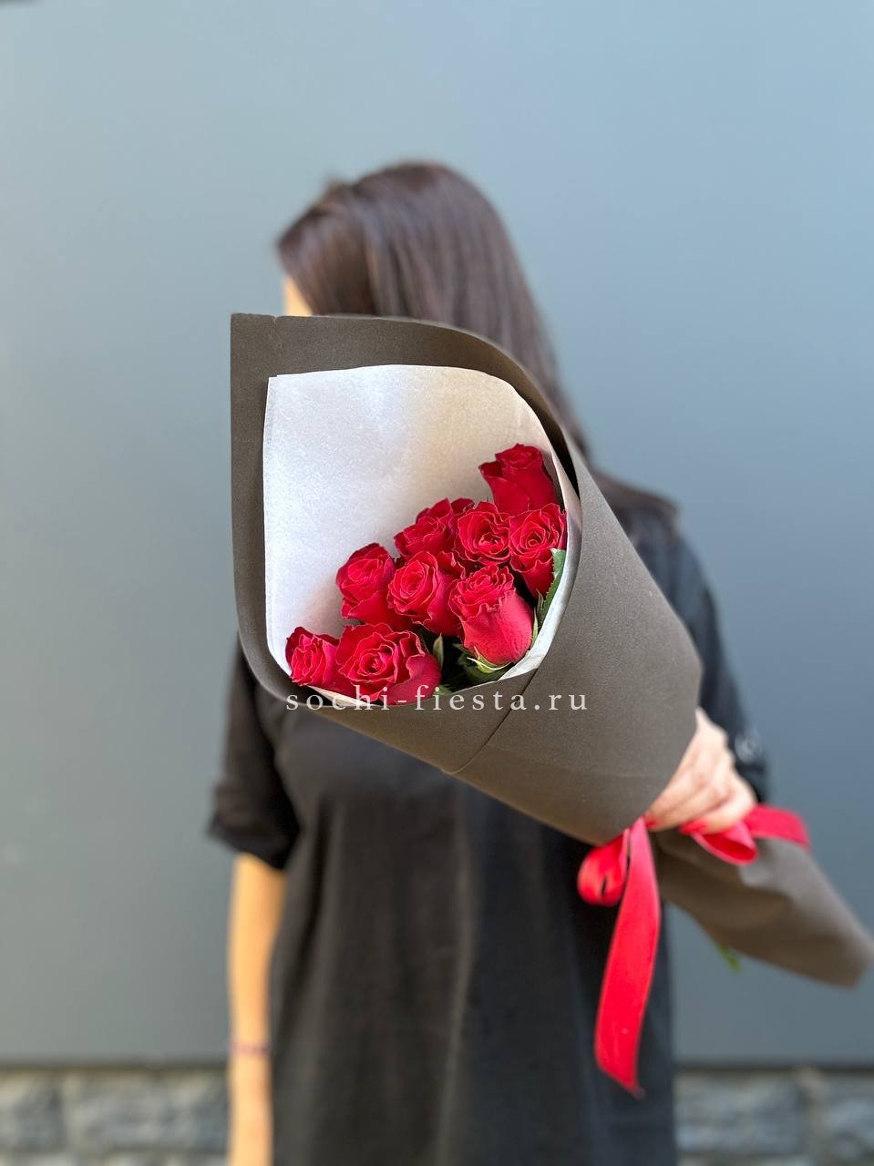 Семнадцать красных роз в обрамлении крафта или дизайнерской пленки — это лаконичная форма с выраженным характером. Букет удобен для вручения и долго радует свежестью.