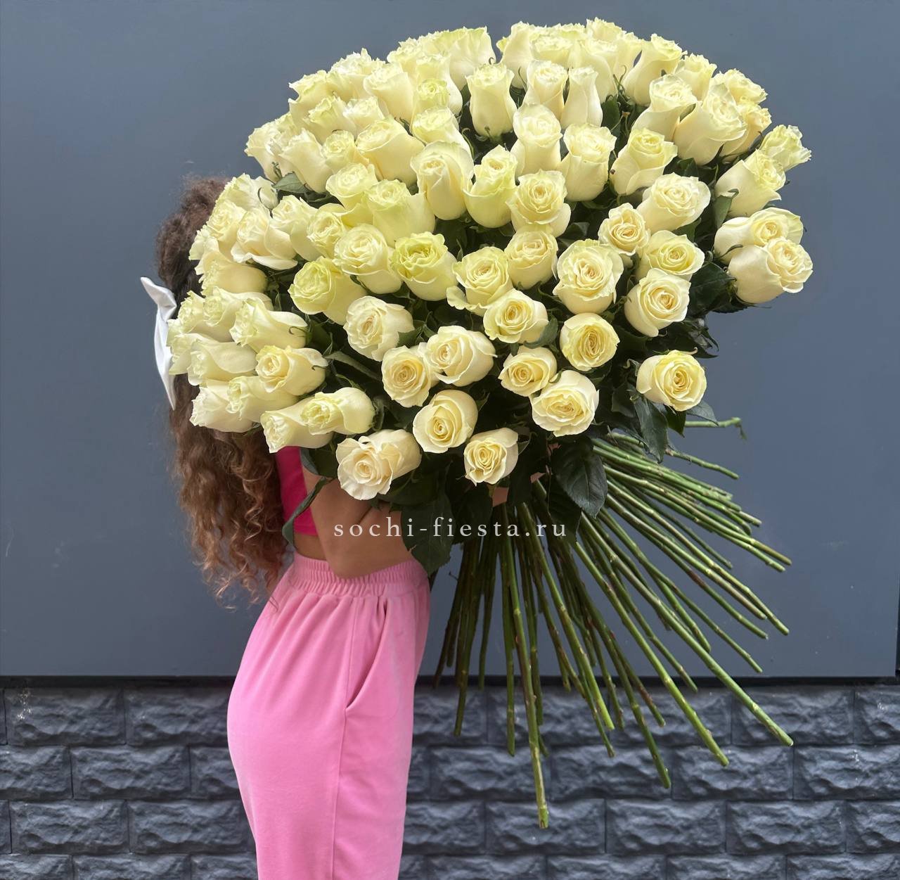 Сто одна белоснежная роза собрана в монументальный букет классической формы. Высокие стебли образуют графичный силуэт, а плотное расположение бутонов создаёт впечатляющий объём. Лаконичная лента завершает композицию.