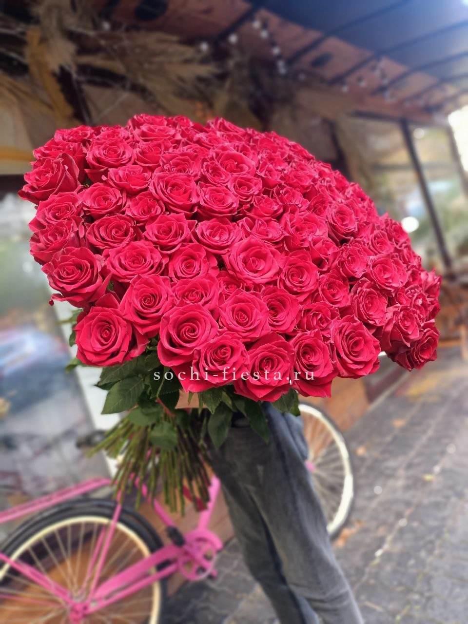 Плотная сборка из ста одной розы образует густую шапку бутонов глубокого красного цвета. Каждый цветок раскрывается постепенно, создавая живую фактуру и визуальную глубину композиции.