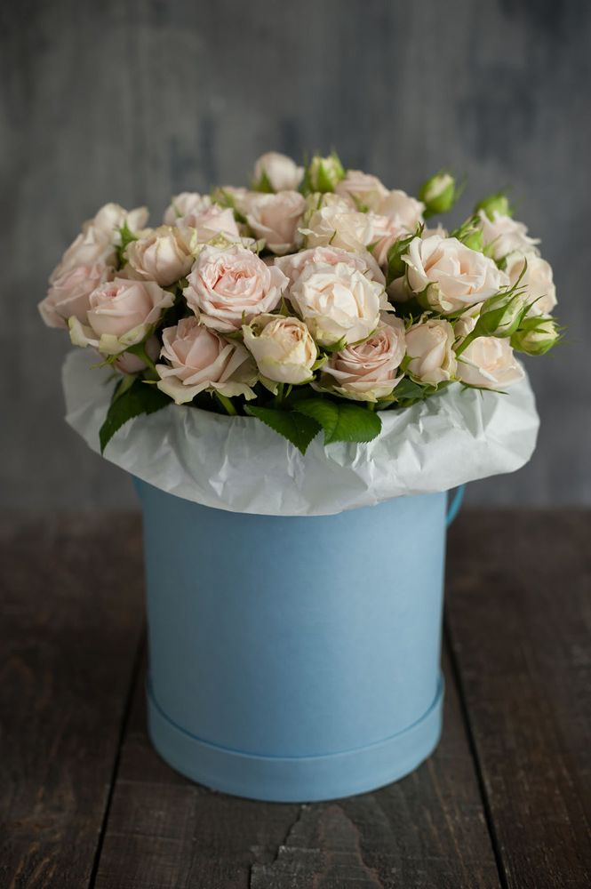 Пятнадцать кустовых роз собраны в плотную округлую форму. Мелкие бутоны создают воздушную текстуру и мягкий объём в пространстве.