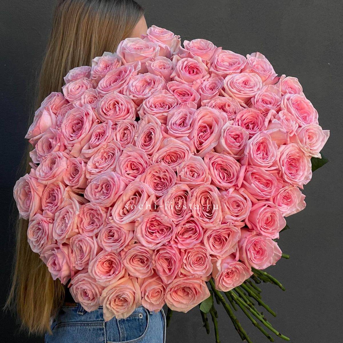 Двадцать пять пионовидных роз в плотной округлой форме создают объёмное облако нежно-розового оттенка. Сорт Pink X-Pression с густомахровыми бутонами собран под ленту без дополнительного декора.