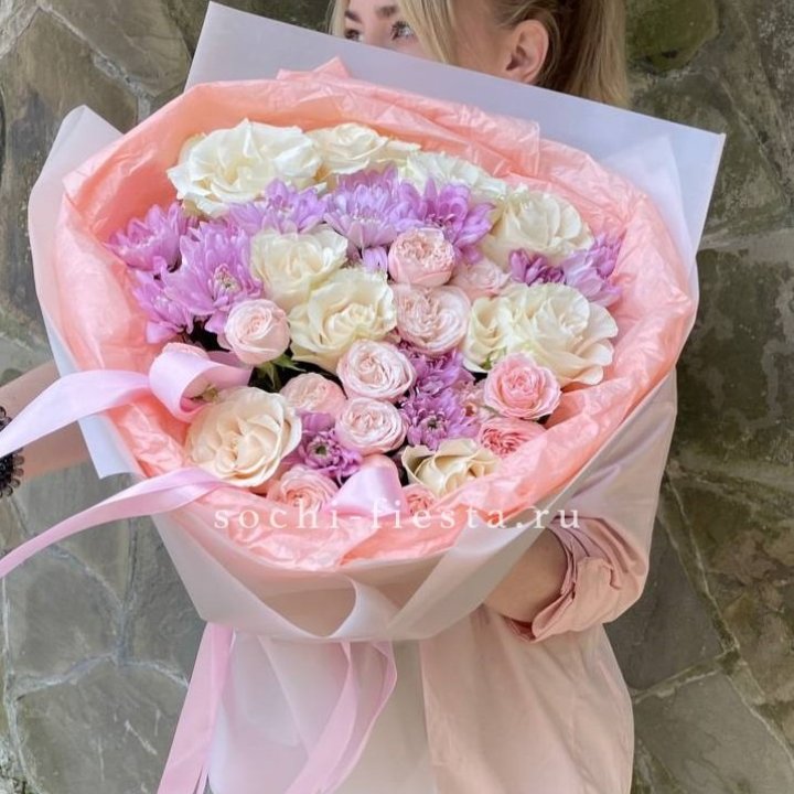 сборный букет из роз и хризантем для подарка в небольшом городе