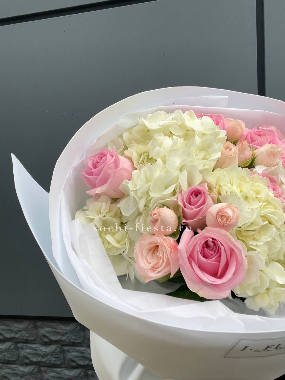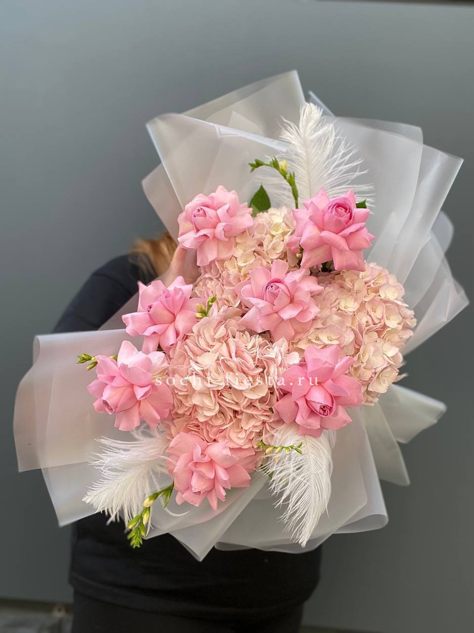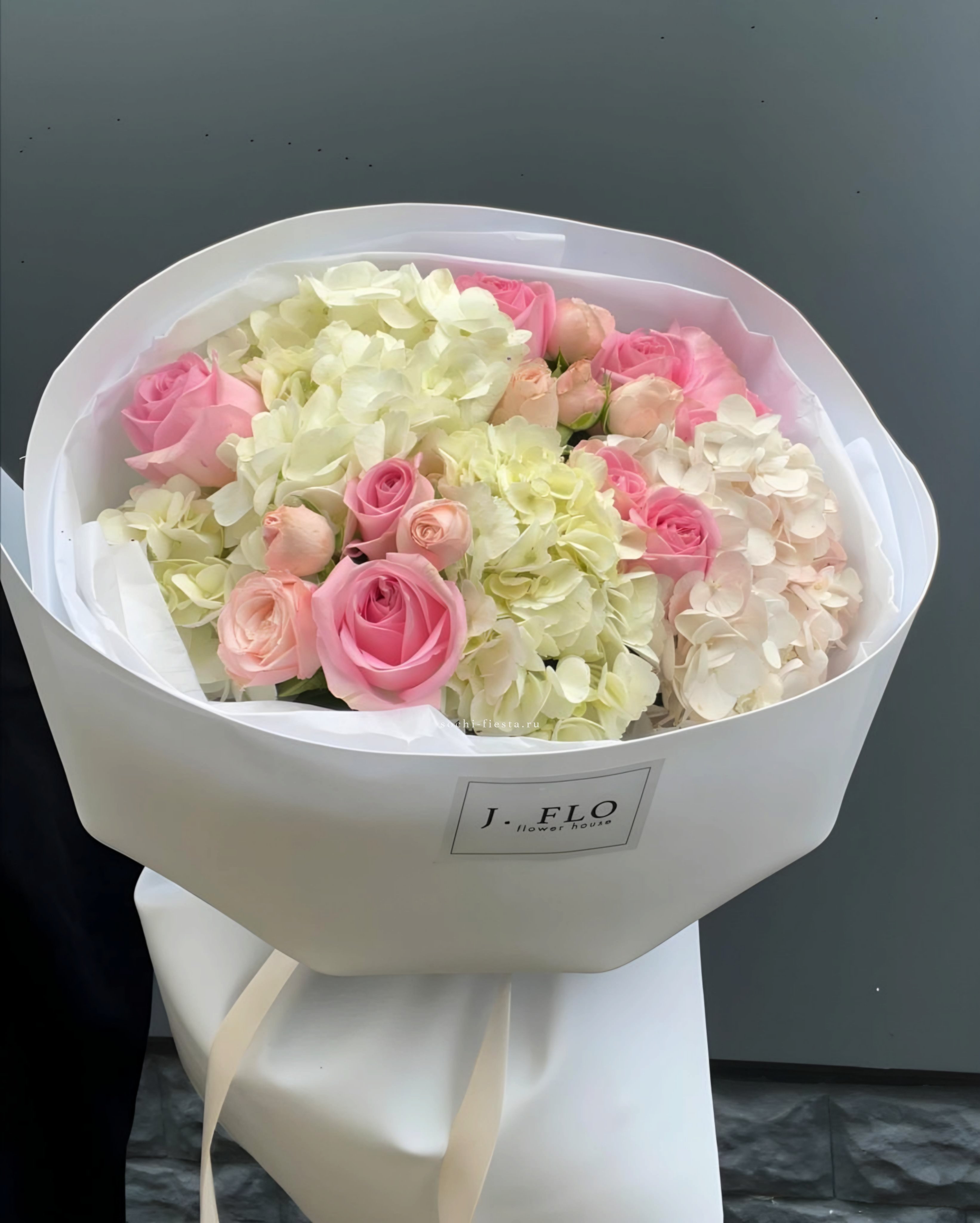 Воздушная композиция с пышной гортензией и розами Джумилия создает объемный силуэт. Маттиола и альстромерия добавляют легкости, а бомбастик вносит яркие акценты в общую структуру букета.