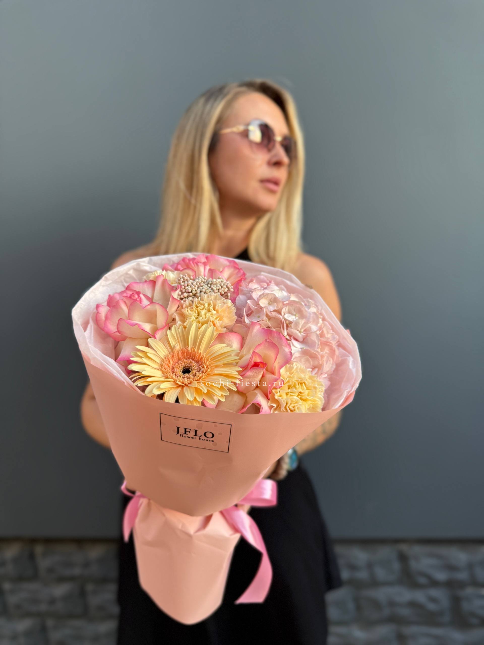 Гортензия и герберы создают плотную цветовую массу, а кустовые розы Мисти Бабблс вносят воздушность. Диантусы и лимониум дополняют композицию текстурой.
