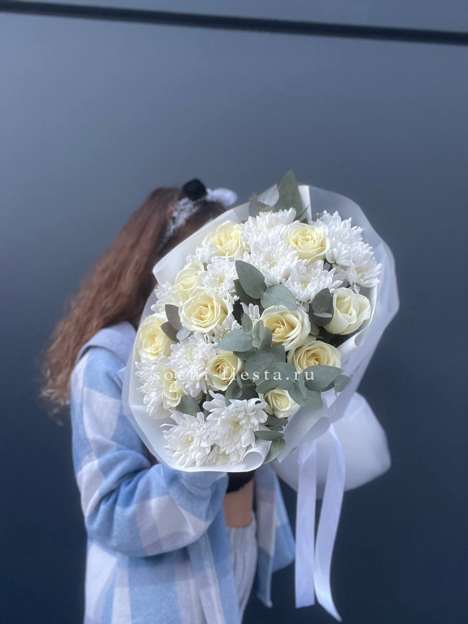 Пастельная гамма с лёгким касанием зимнего воздуха. Кустовые розы и диантус окружены воздушным ковылём, создавая мягкую текстуру с едва уловимой графикой. Гортензия добавляет объём, не перегружая силуэт.