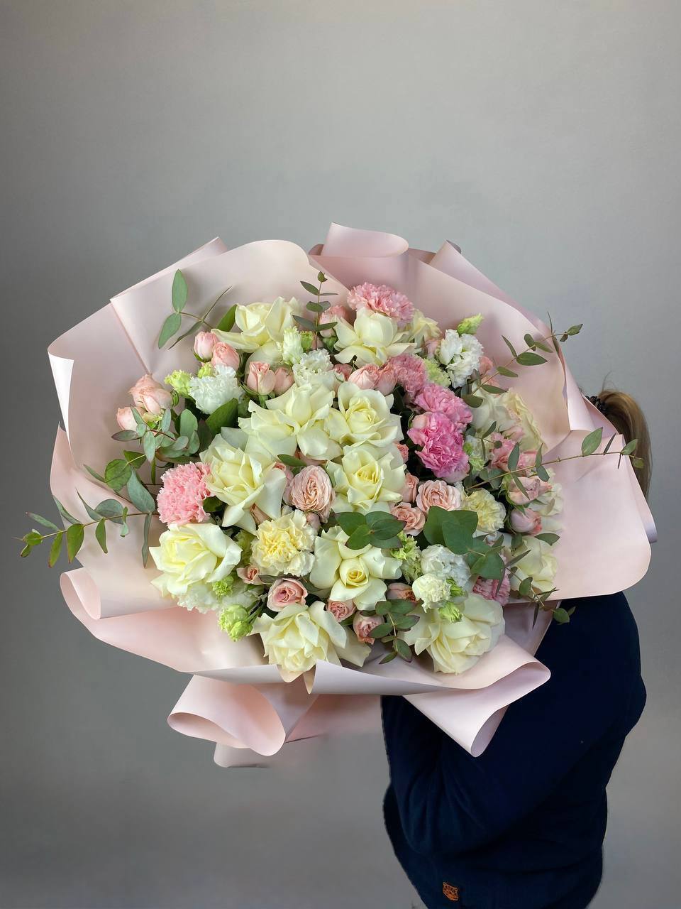 диантус, бомбастик, белые розы, эвкалипт, эустома, упаковка.
