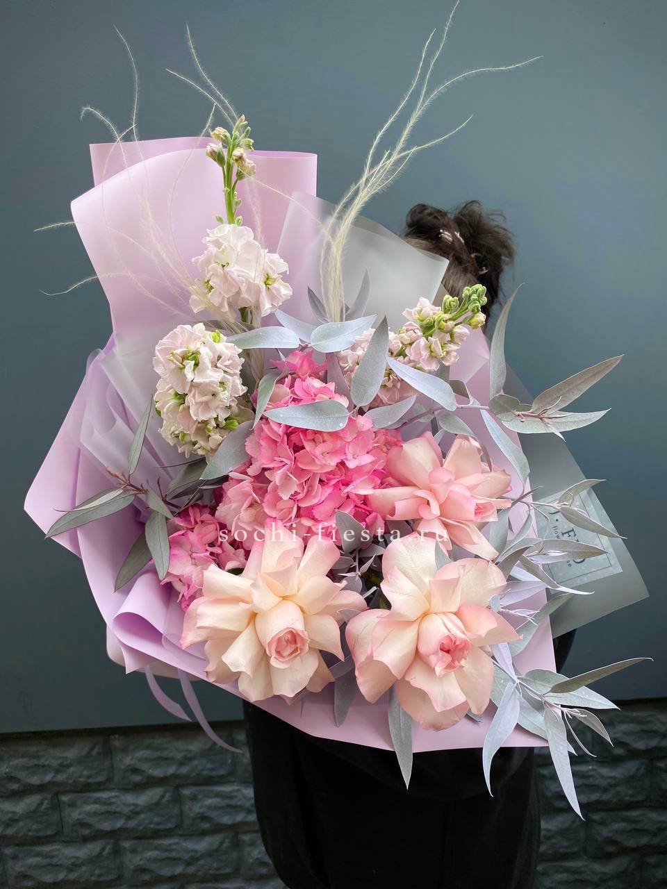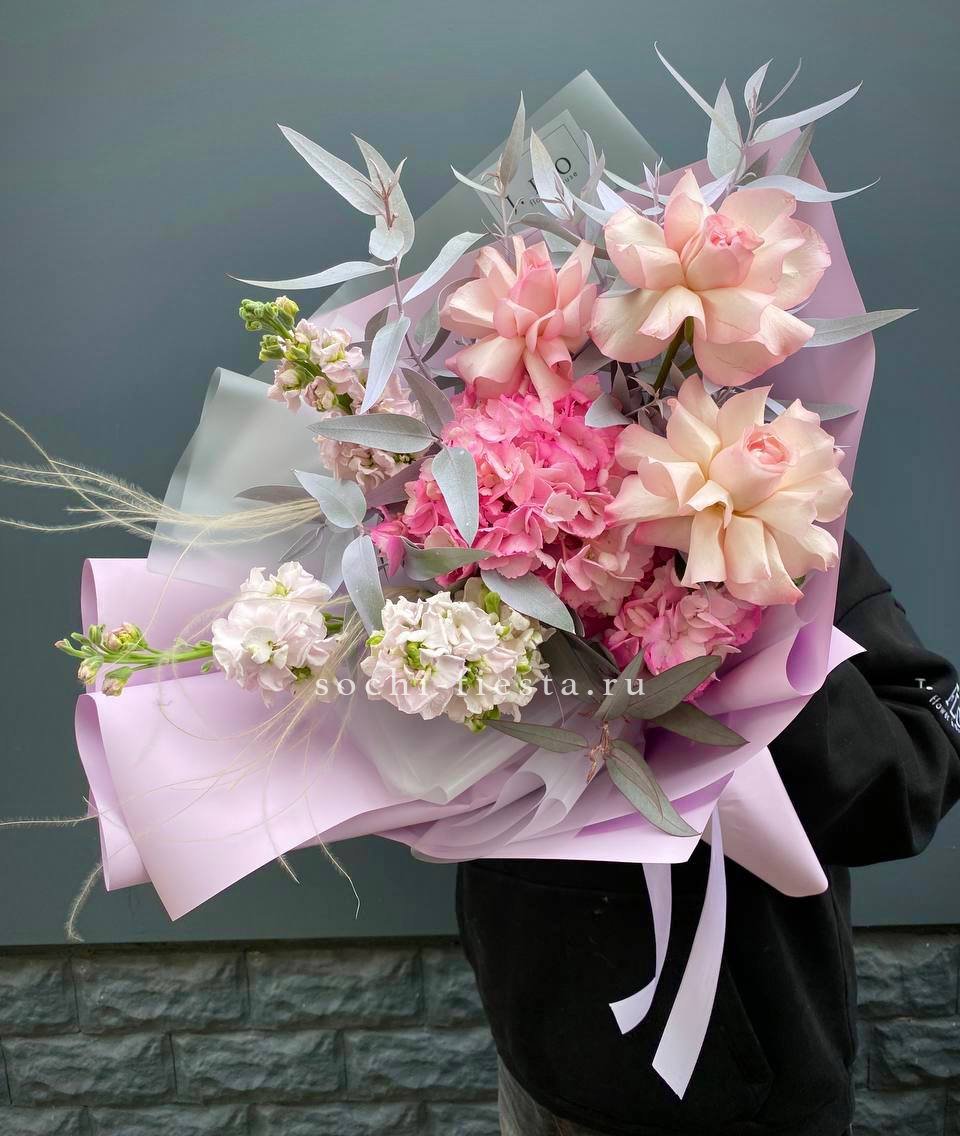 французские розы, маттиола, гортензии, эвкалипт, стифа, упаковка, лента.