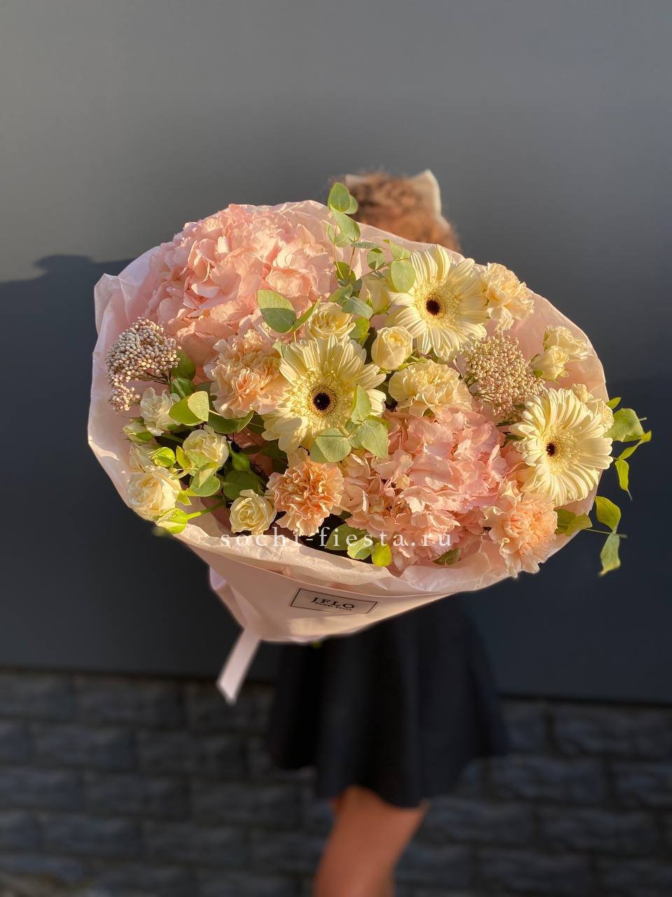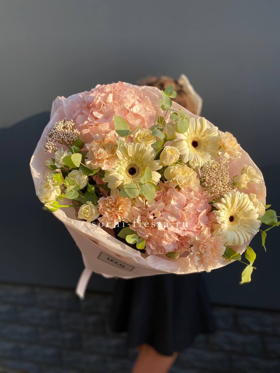 гортензия, роза, гербера, эустома, диантус, дельфиниум, эвкалипт, лента, дизайнерская пленка.