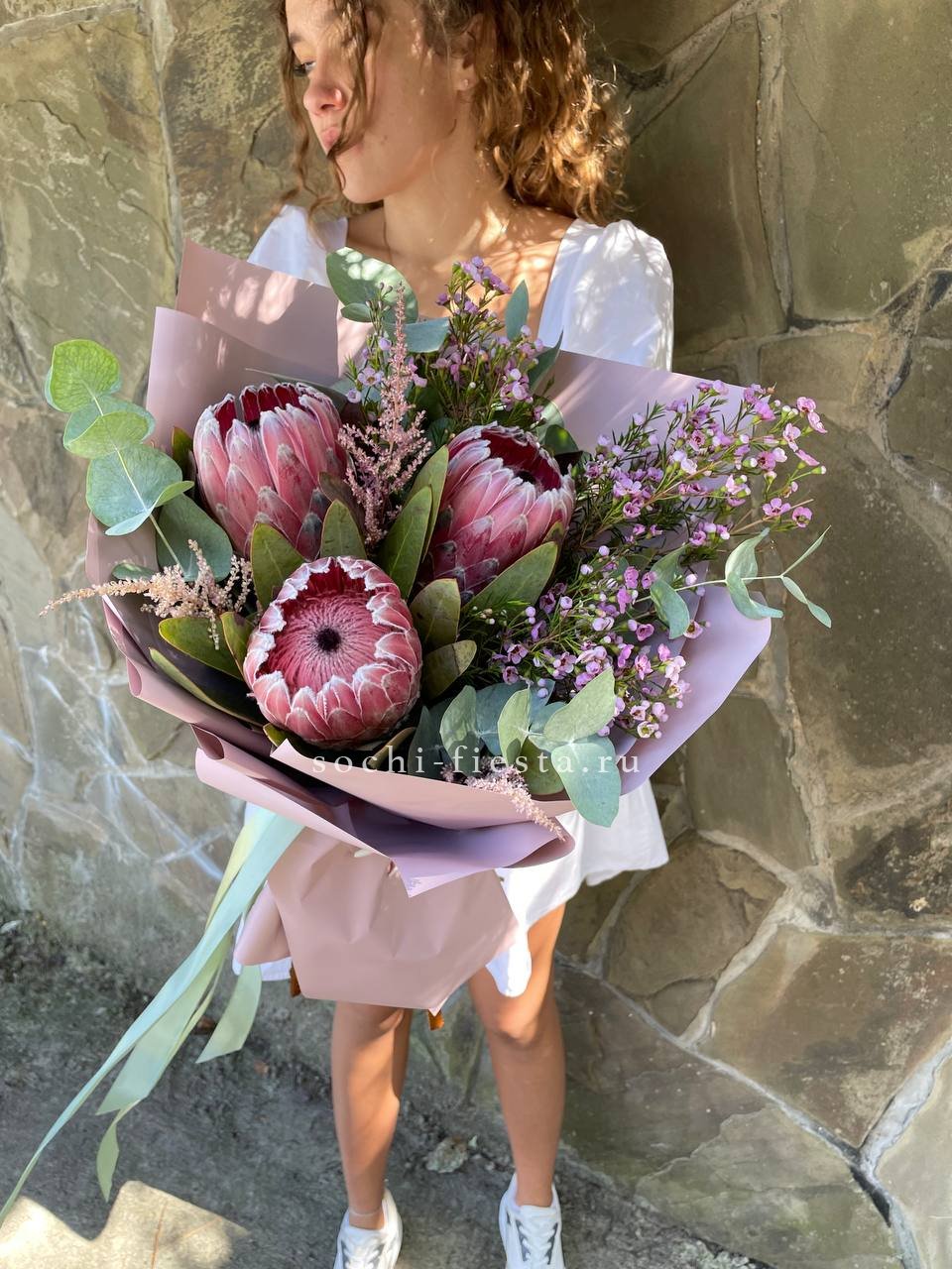 протея, декоративная зелень в зависимости от сезона, дизайнерская упаковка.